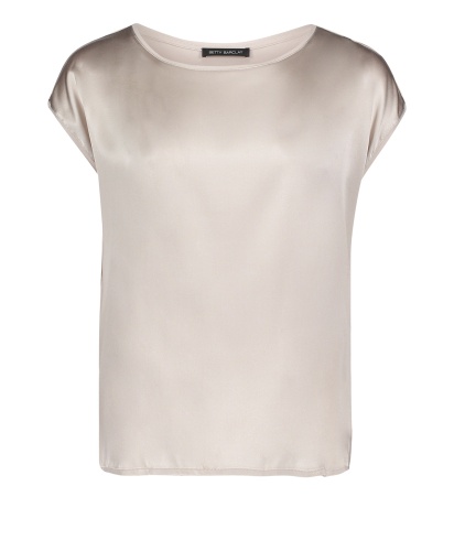 Однотонный топ - базовая модель, которая является обязательной вещью в любом гардеробе. Топ прямого покроя с вырезом-лодочкой и короткими цельнокроеными рукавами. Блестящий атласный перед изделия контрастирует с матовой спинкой. Материал из смеси шелка и эластана обеспечивает комфорт и идеально подходит для теплого времени года. В этом лаконичном и элегантном топе вы будете выглядешь шикарно, независимо от выбранного варианта низа и обуви.