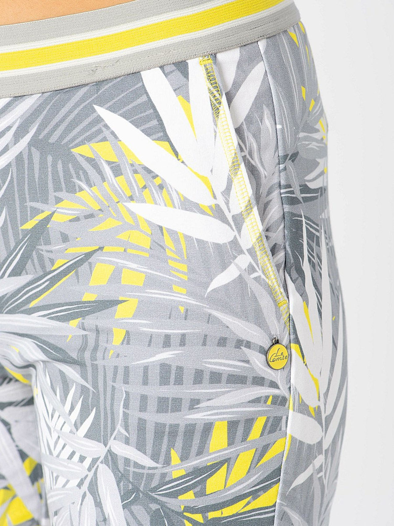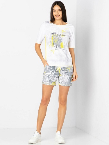 Шорты с прорезными карманами. Трендовый принт с тропическими мотивами, яркие цветовые акценты. Эластичная лента на поясе. Приятный к телу материал из смеси хлопка и эластана.