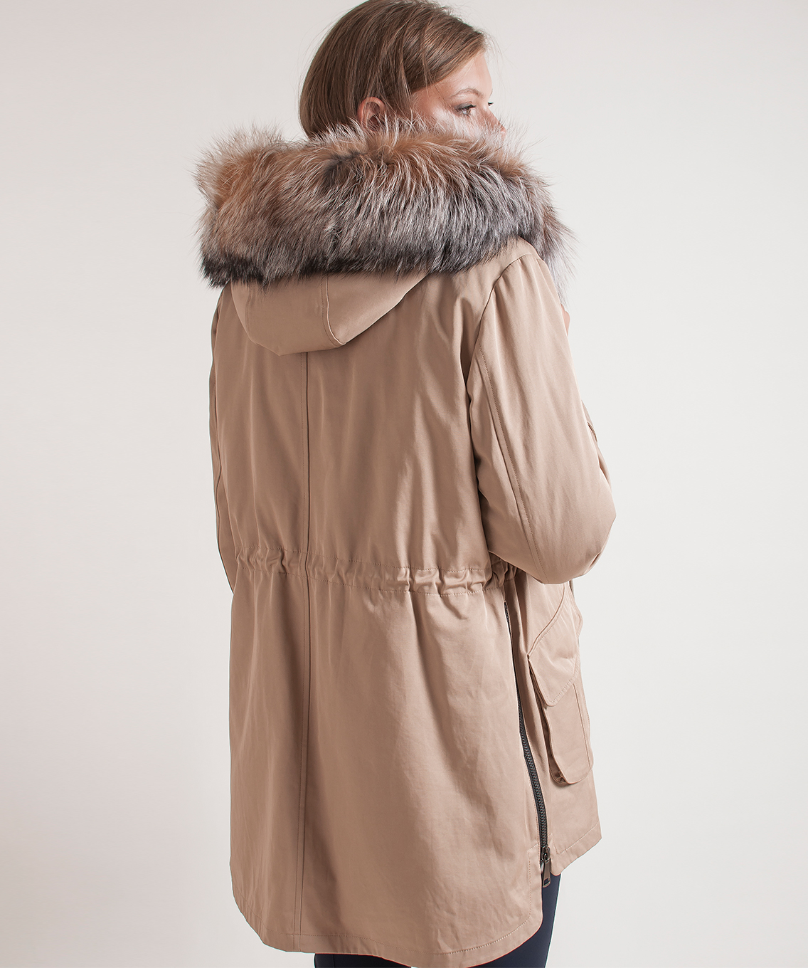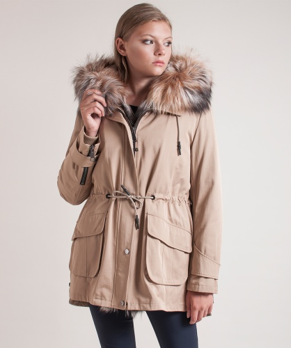 Теплая пихора на подкладке из натурального меха кролика. Плотная ткань верха. Прямой покрой, кулиска на талии. Удлиненная спинка, замки-молнии по бокам. Накладные карманы на клапанах. Рукава декорированы замками и патой на кнопке. Оторочка капюшона из натурального лисьего меха.