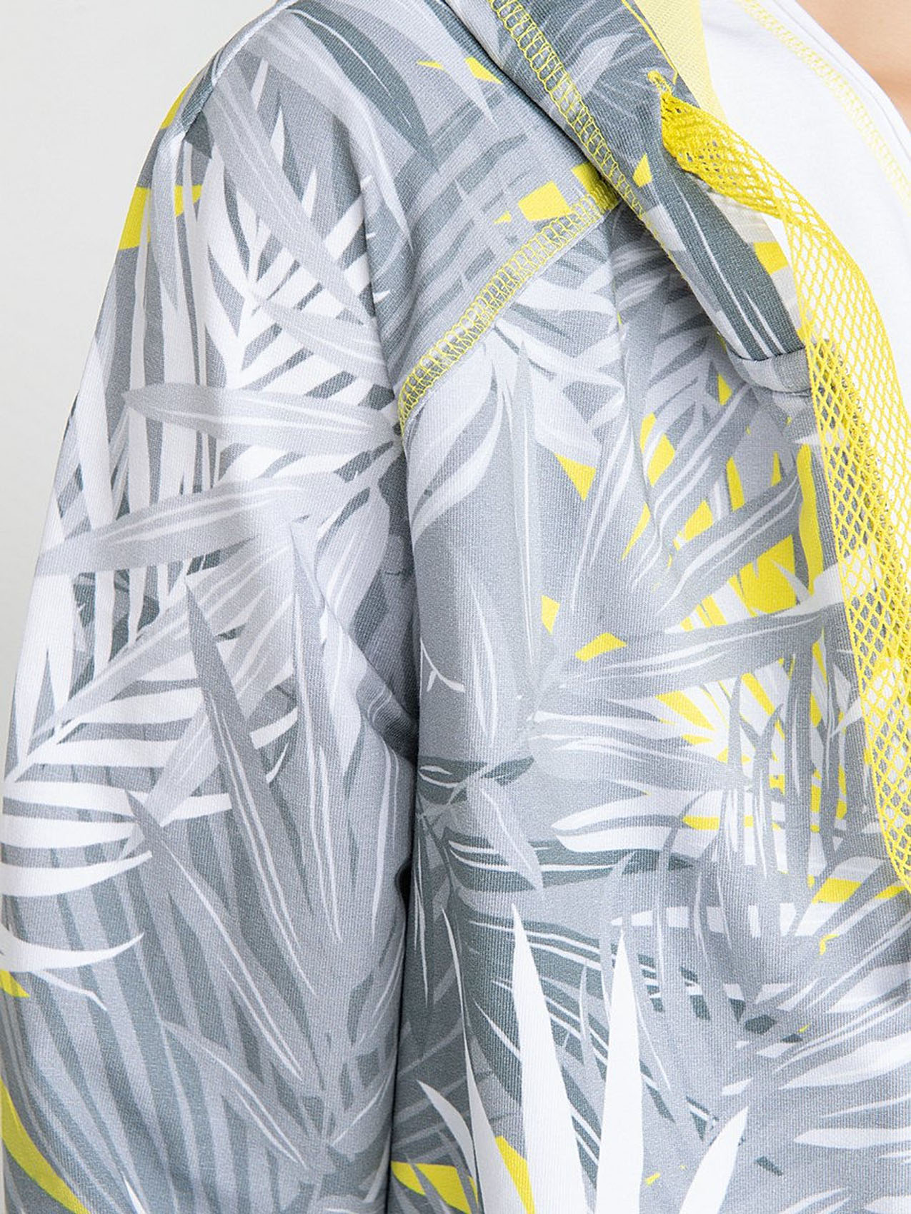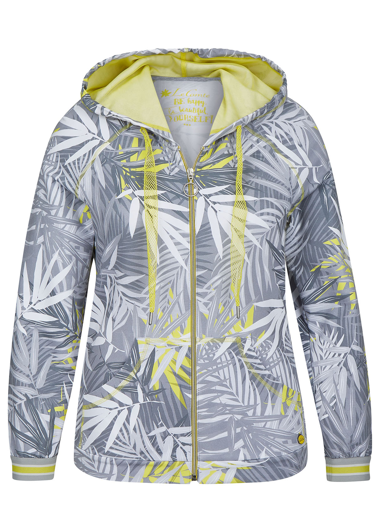 Блейзер с капюшоном. Трендовый принт с тропическими мотивами. Длинные рукава с трикотажными манжетами. Прорезные карманы. Замок-молния. Приятный к телу материал из смеси хлопка и эластана. Длина изделия по спинке: 67 см.
