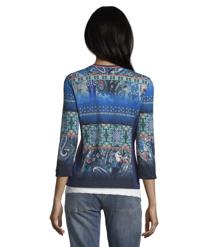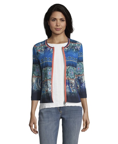 Блейзер приталенного силуэта подчеркивает достоинства фигуры. Круглый вырез горловины, застежка-молния, рукава 3/4. Материал из хлопковой смеси обеспечивает комфорт. Этнический принт и красивое сочетание контрастных цветов непременно обратят на себя внимание. Эта яркая вещь освежит любой комплект одежды!