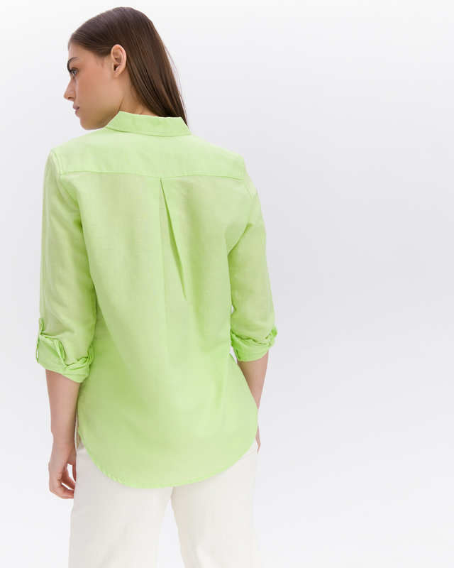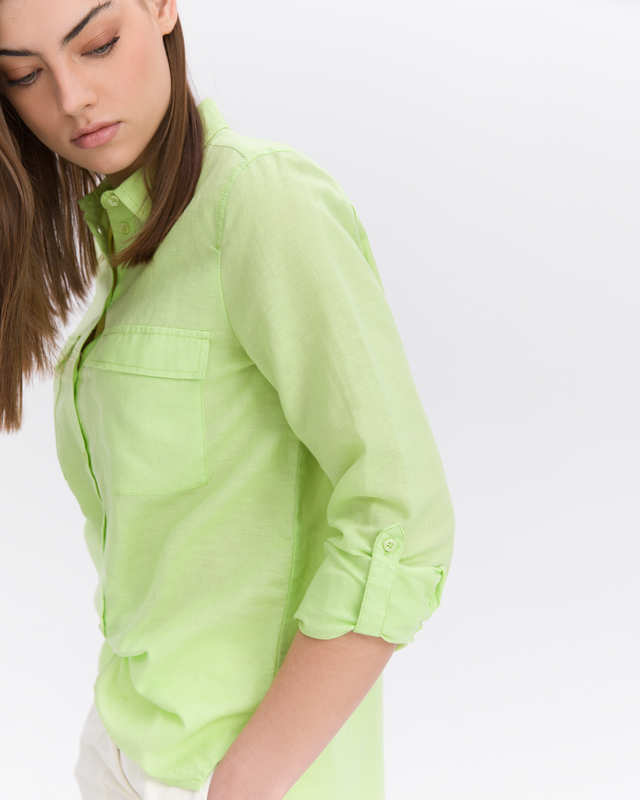 Однотонная блузка нежного салатового оттенка отлично впишется в гардероб любой современной женщины. Материал из смеси льна и хлопка приятен к телу и обеспечивает правильную терморегуляцию. Отложной рубашечный воротник, накладные нагрудные карманы с клапаном. Втачной рукав полной длины с манжетой.