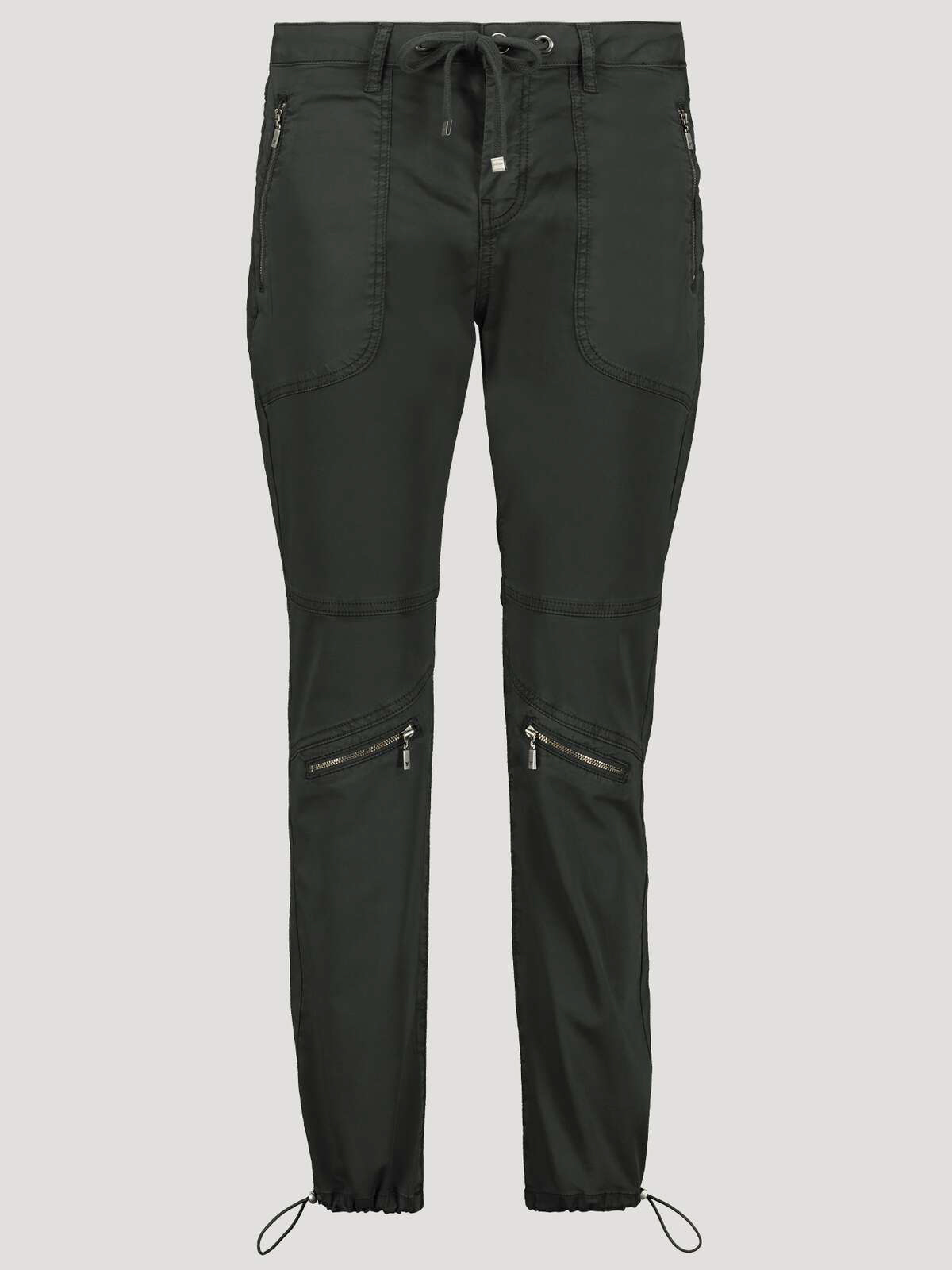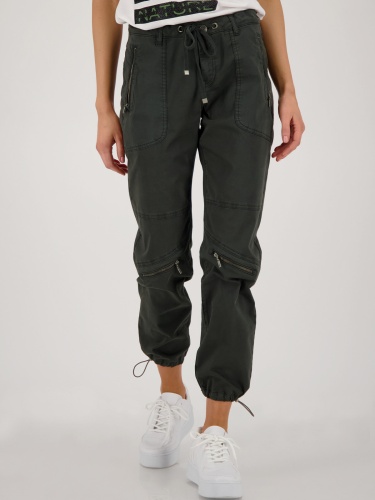 Однотонные джоггеры цвета хаки для повседневного городского образа в стиле кэжуал. Эластичный пояс с кулиской обеспечивают комфортную посадку. Объемные накладные карманы, молнии на коленях. Кулиска по низу штанин.