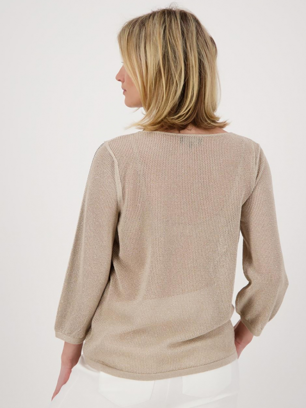Полупрозрачный пуловер из сетки крупной вязки с текстовым принтом. Втачной рукав полной длины, горловина-лодочка.