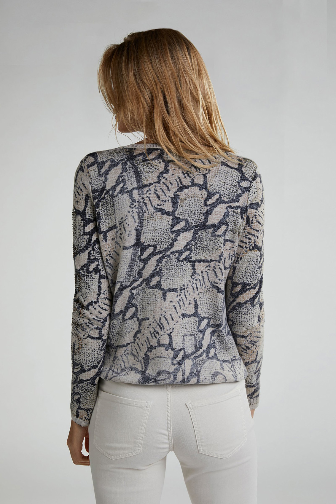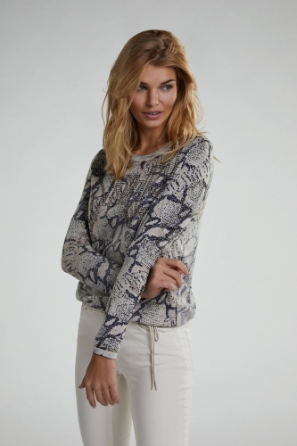 Этот джемпер непременно обратит на себя внимание благодаря необычному абстрактному принту. Джемпер прямого покроя с кулиской по низу изделия. Горловина-лодочка, длинные рукава. Декор стразами придает гламурный блеск. Хлопковый материал приятен к телу и обеспечивает комфорт. В сочетании с лаконичным низом джемпер создает стильный современный образ.