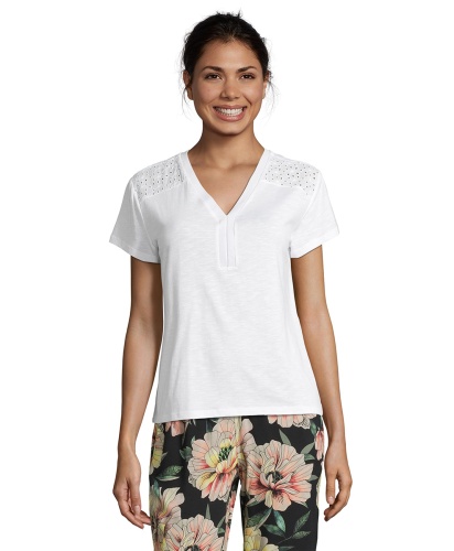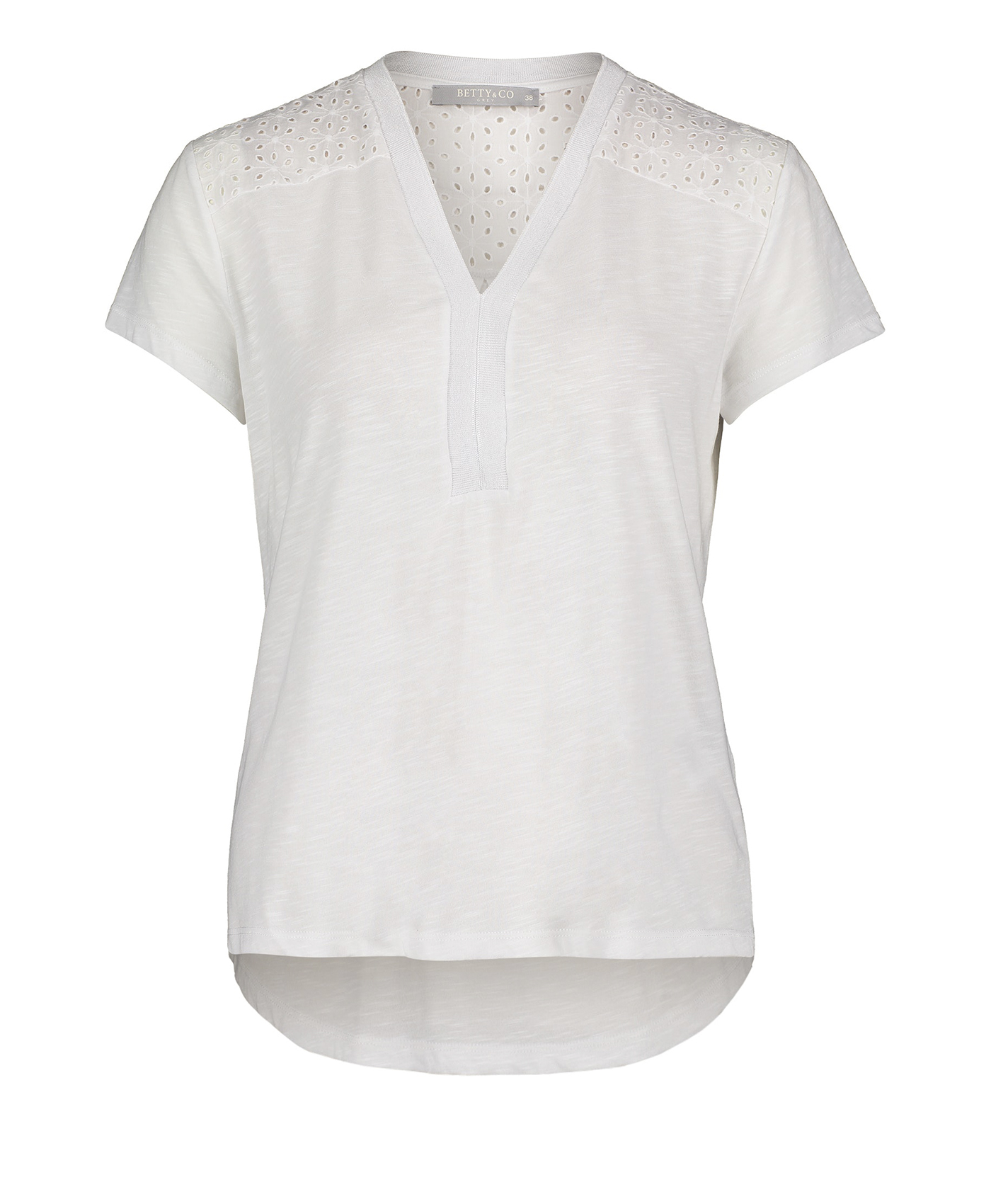 Эта стильная футболка создает романтический образ. Прямой покрой, V-образный вырез, короткие рукава, удлиненная спинка изделия. Ажурные вставки на кокетке переда и спинки изделия подчеркивают женственность обладательницы футболки. Материал из смеси хлопка и модала приятен к телу и обеспечивает комфорт. Эта футболка отлично сочетается как с брюками, так и с юбкой.