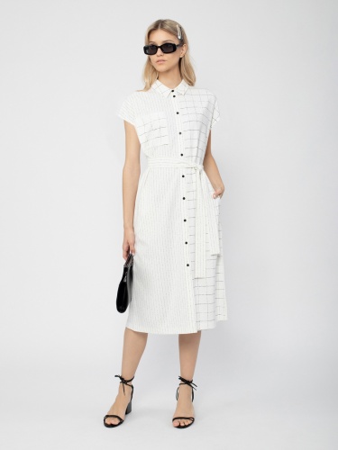 Платье из вискозной смеси в принте прямого силуэта с коротким рукавом кимоно, отложным воротником и застежкой спереди на пуговицы. В комплект входит съемный пояс из основной ткани. Спереди накладной карман прямоугольной формы.