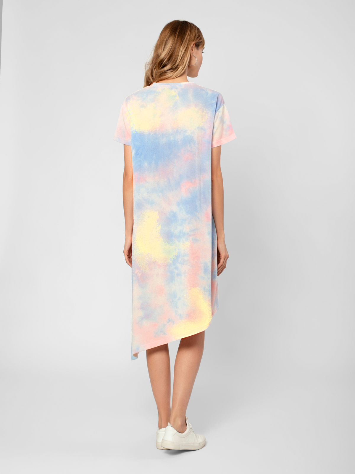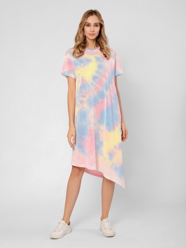 Платье из хлопкового трикотажа силуэта трапеция с круглым вырезом горловины и коротким втачным рукавом. Низ изделия асимметричный.