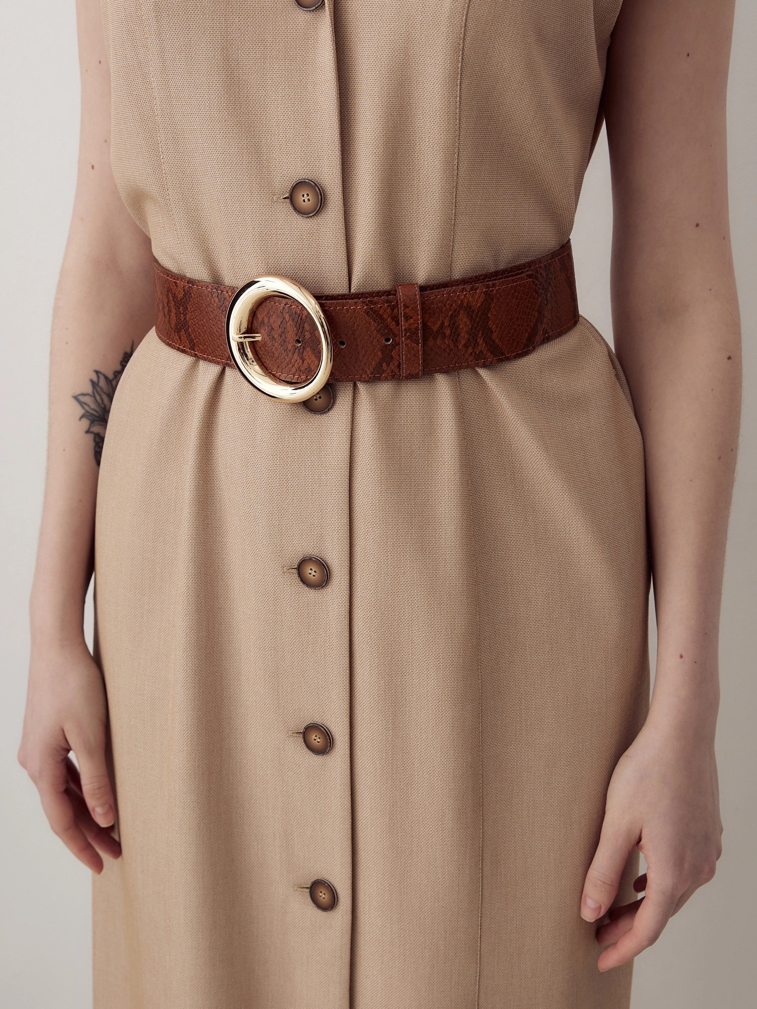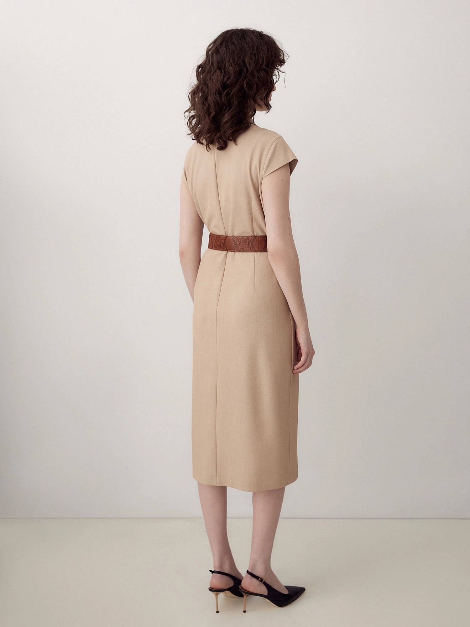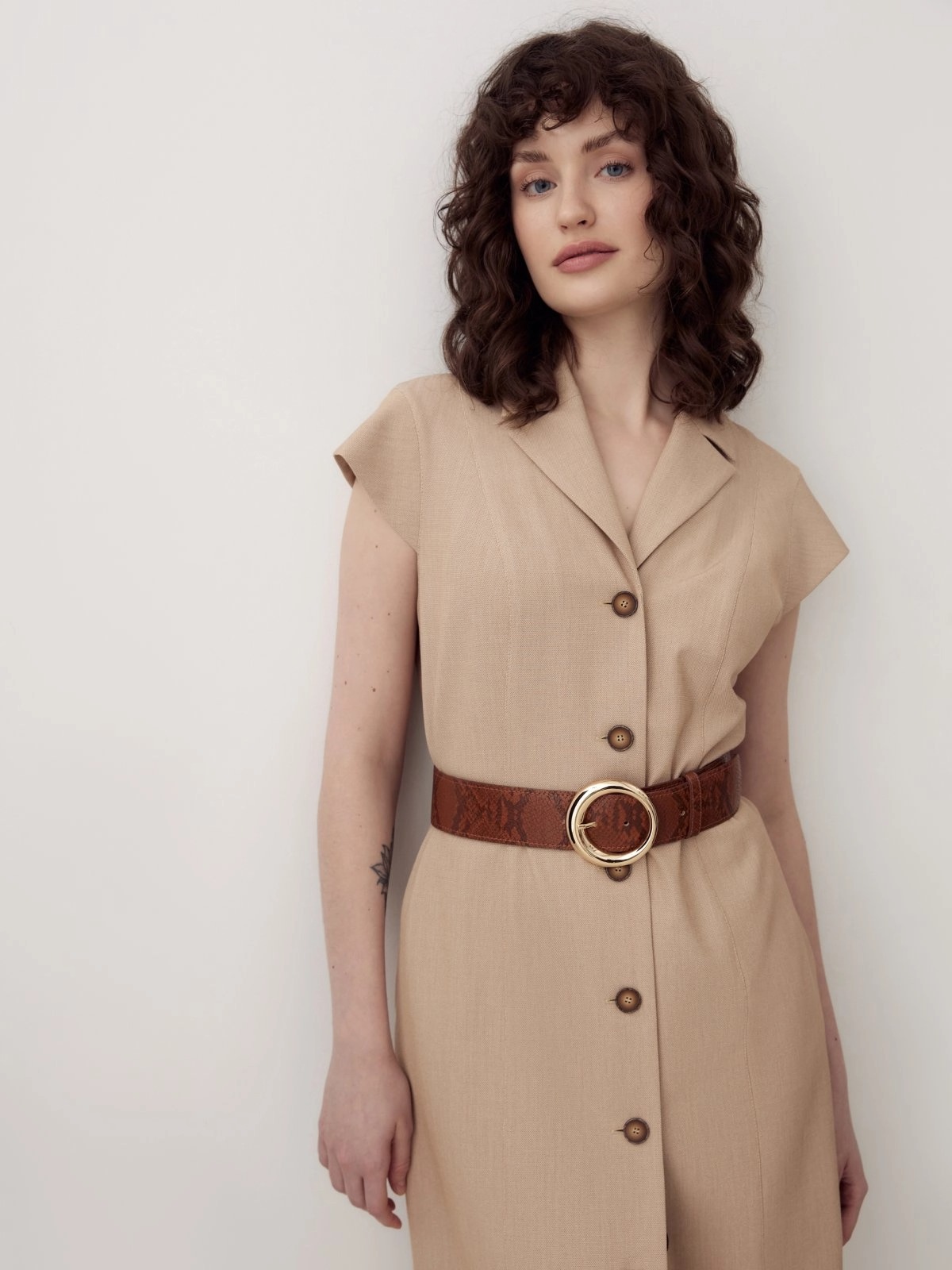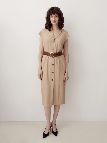 Платье в стиле сафари на пуговицах. С небольшим английским воротником с отстрочками. Рельефы из плеча. Есть небольшие рукавчики с манжетами. В комплект входит широкий ремень из экокожи.