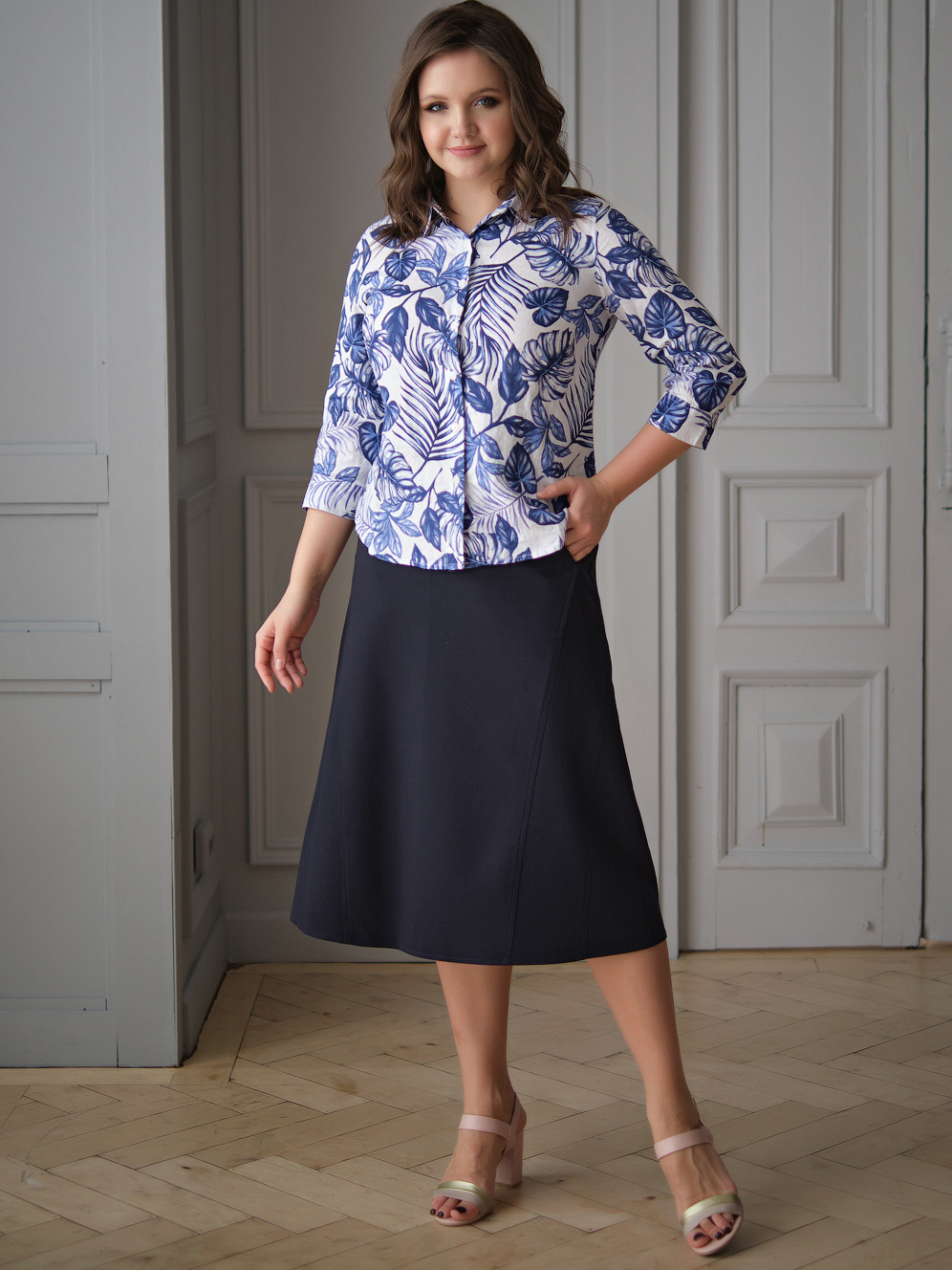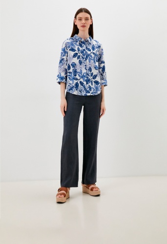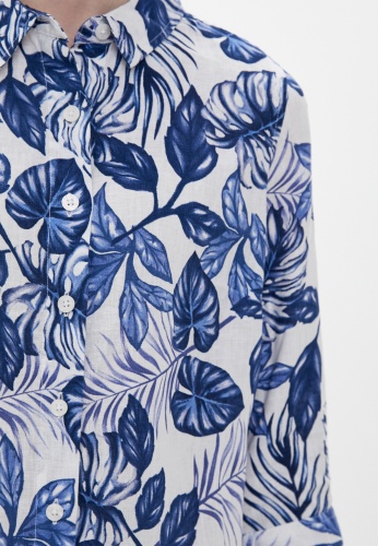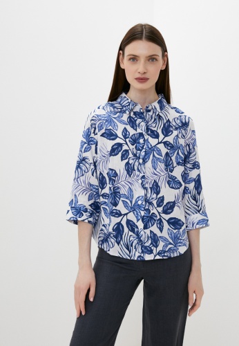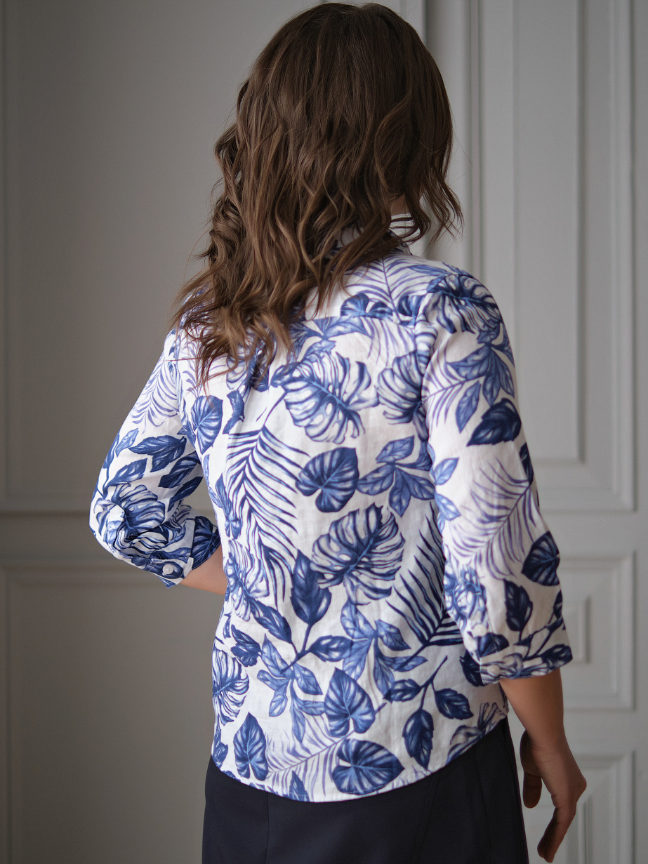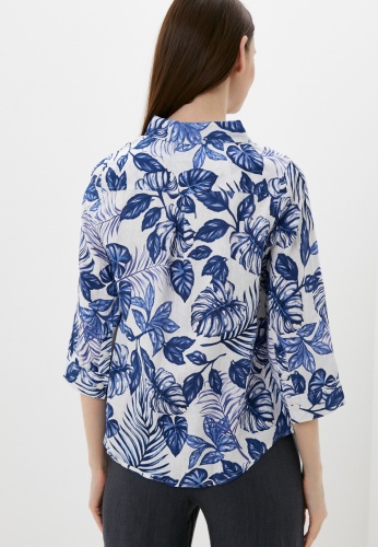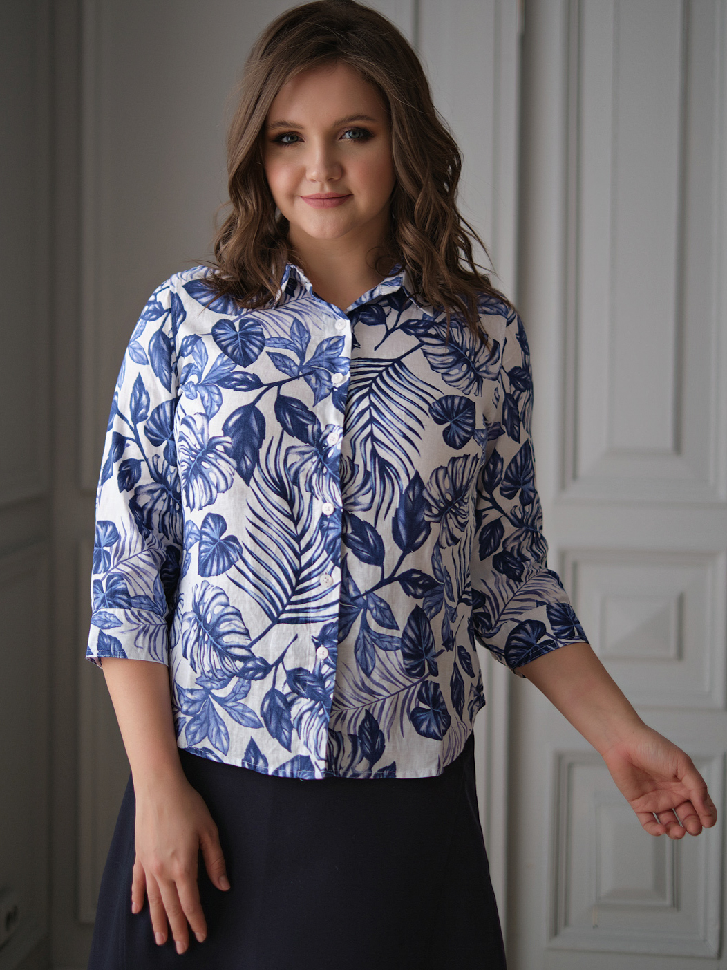 На сайте указаны Российские размеры. Льняная блузка с тропическим орнаментом - идеальный вариант для теплого сезона. Материал дышит, приятен к телу и обеспечивает правильную терморегуляцию. Прямой крой скрывает недостатки фигуры и подчеркивает ее достоинства. Втачной рукав ¾ с манжетой. Отложной рубашечный воротник. Застежка на пуговицы. Ткань: блузка из качественного 100% льна средней плотности – идеального материала, который одинаково комфортен как летом, так и в межсезонье. Крой: модель имеет свободный силуэт, среднюю длину, подходящую под разные типы фигур, и актуальный втачной рукав ¾ с манжетом. Лаконичный рубашечный воротник красиво подчеркивает зону шеи. Отделка: стильный бело-синий принт с тропическими монстерами, не выходящими из моды на протяжении многих сезонов, освежает образ и придает ему курортного очарования. Застежка-планка и манжеты украшены пуговицами, которые легко вдевать. Встречная планка под кокеткой обеспечивает максимальный комфорт при движении. Универсальная модель прекрасно со