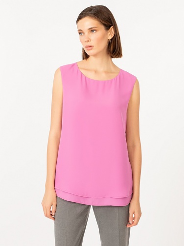 Блуза без рукавов в нежном розовом оттенке. Прямой крой идеально подходит для любого типа фигуры. Овальный вырез горловины подчеркивает линию шеи. Блузу предпочтительно носить навыпуск с брюками.