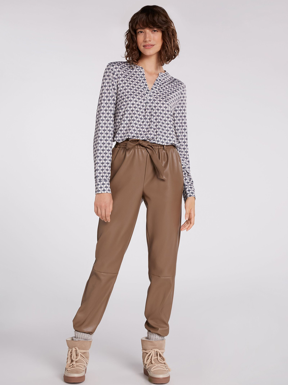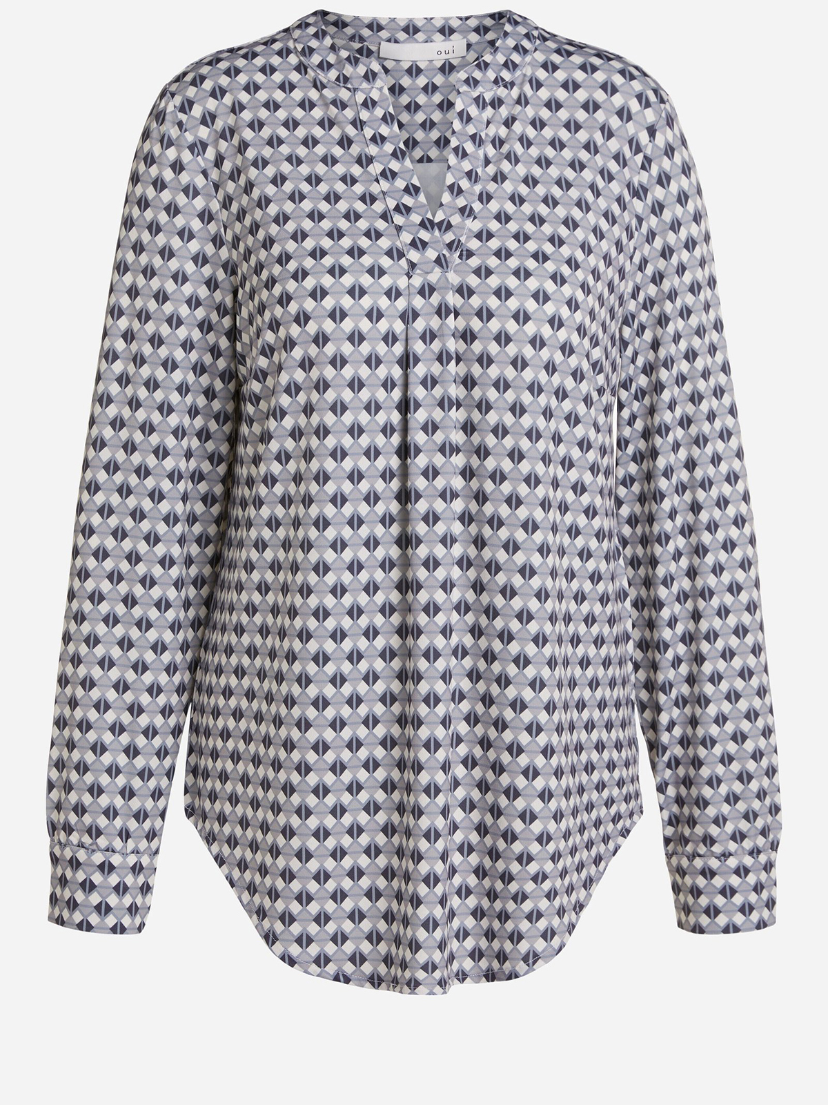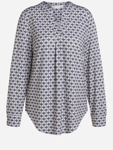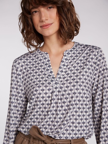 Блуза с оригинальным геометрическим узором по всей поверхности изделия. V-образный вырез горловины, длинные втачные рукава с манжетами на пуговицах.
