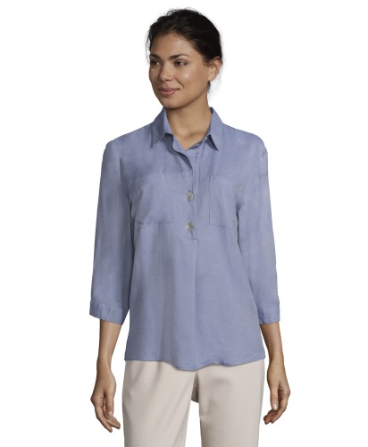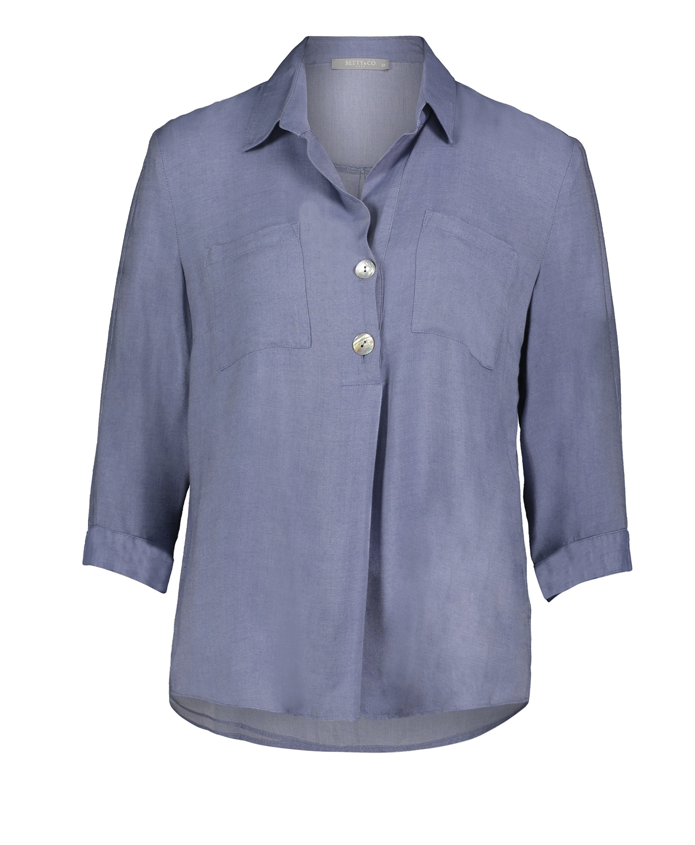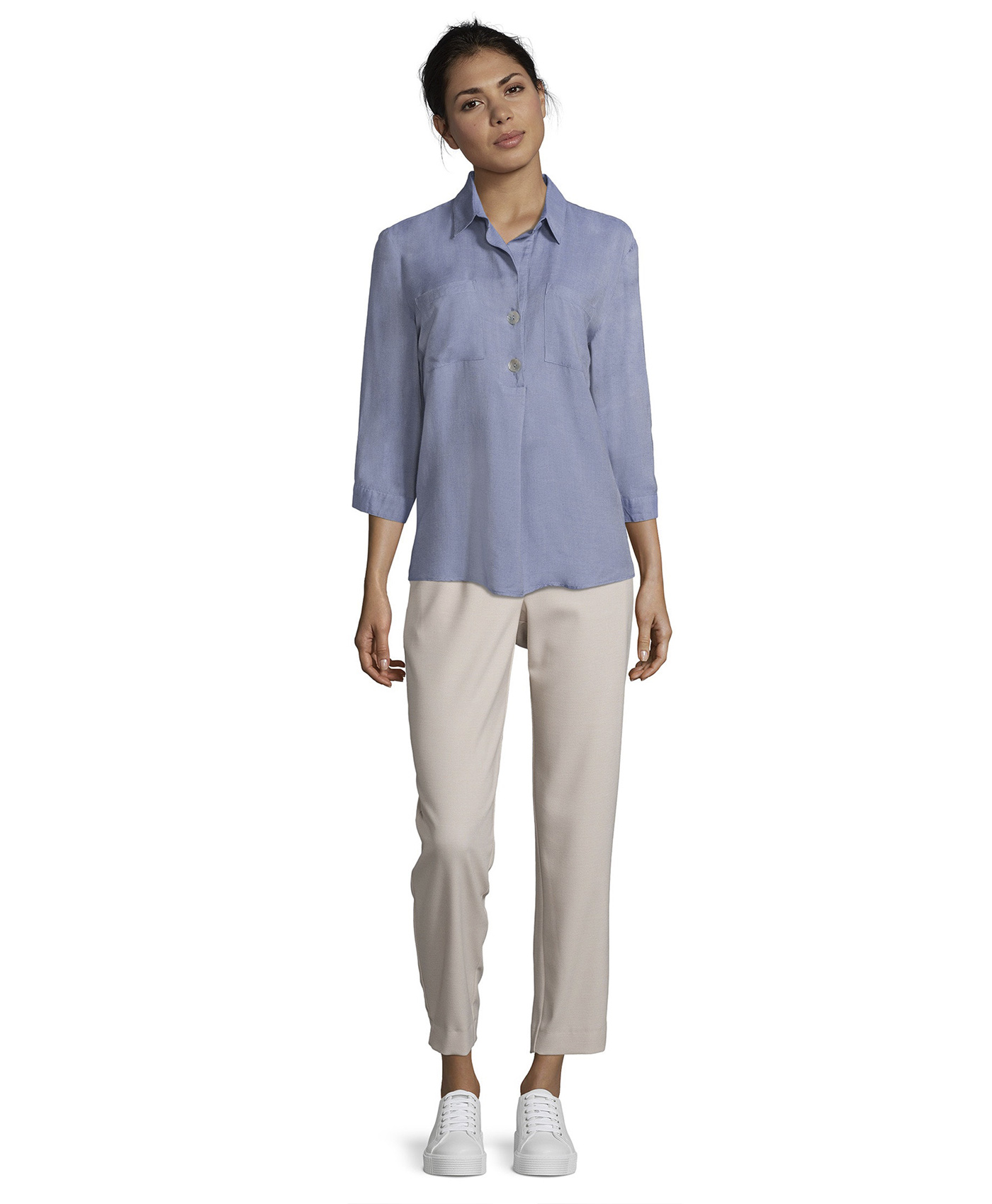 Блуза прямого покроя. Отложной воротничок, застежка на пуговицах, карманы на груди, рукава 3/4. Вискозный материал приятен к телу и обеспечивает максимальный комфорт. В сочетании с любыми брюками и обувью блуза обеспечивает стильный современный образ!