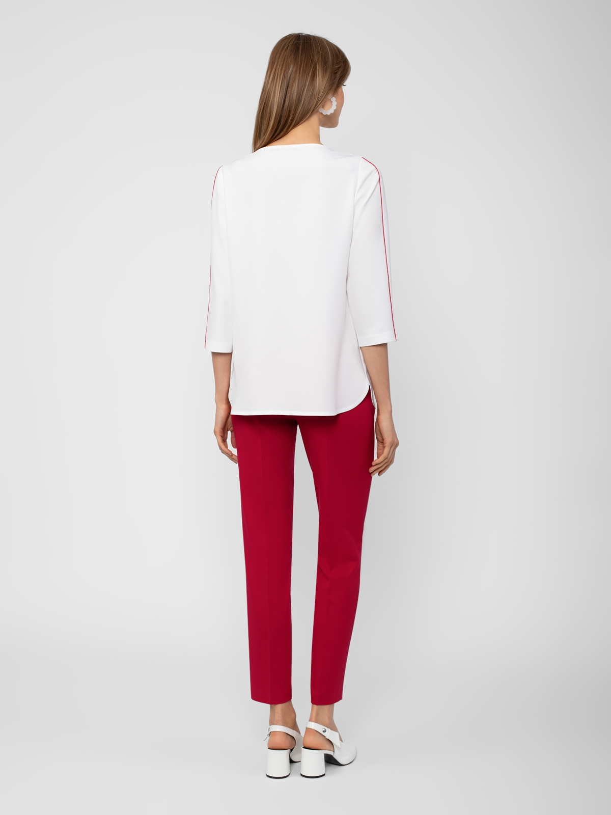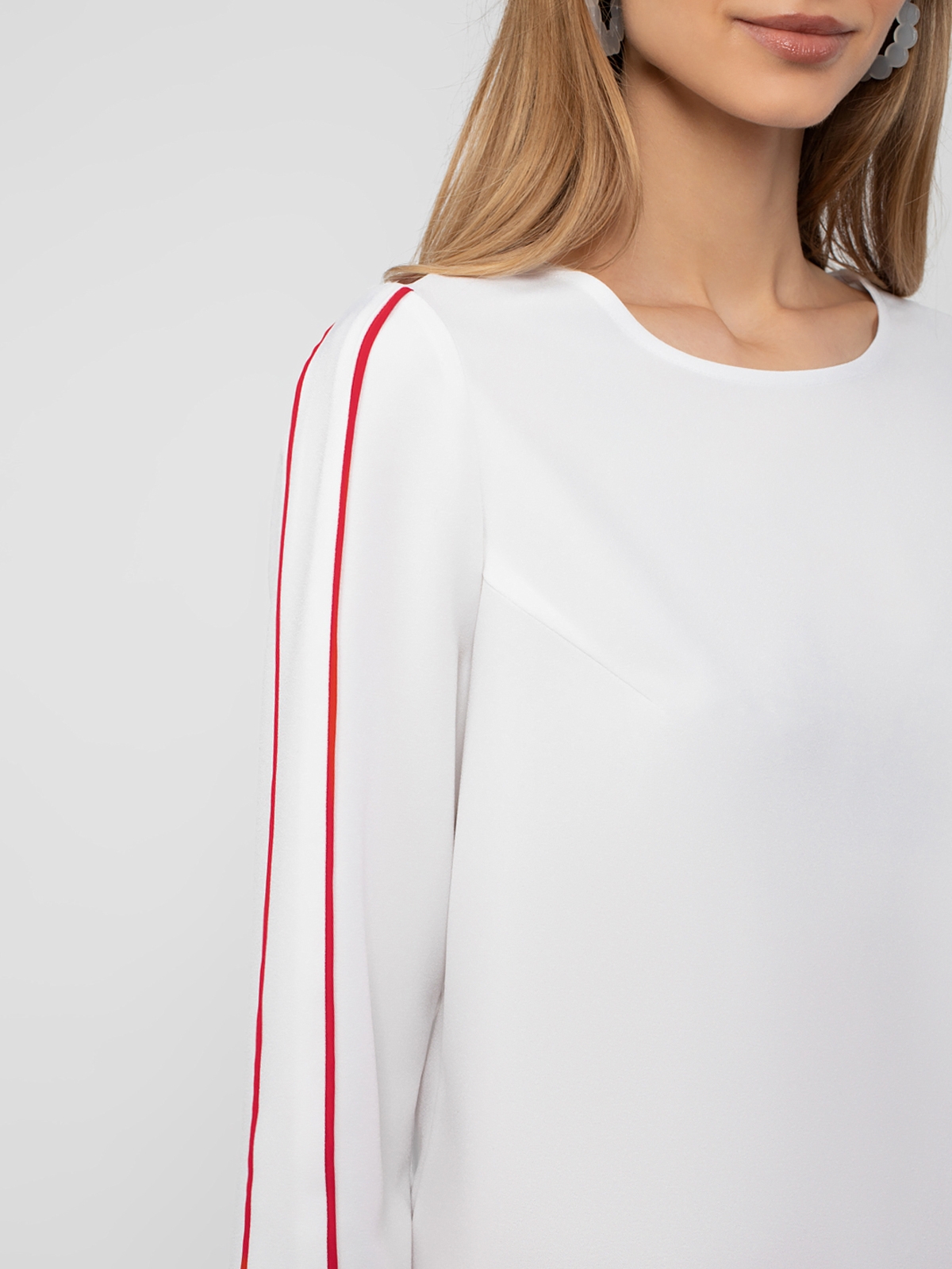 Блуза прямого силуэта с круглой горловиной и укороченным втачным рукавом. На рукавах контрастные декоративные лампасы.