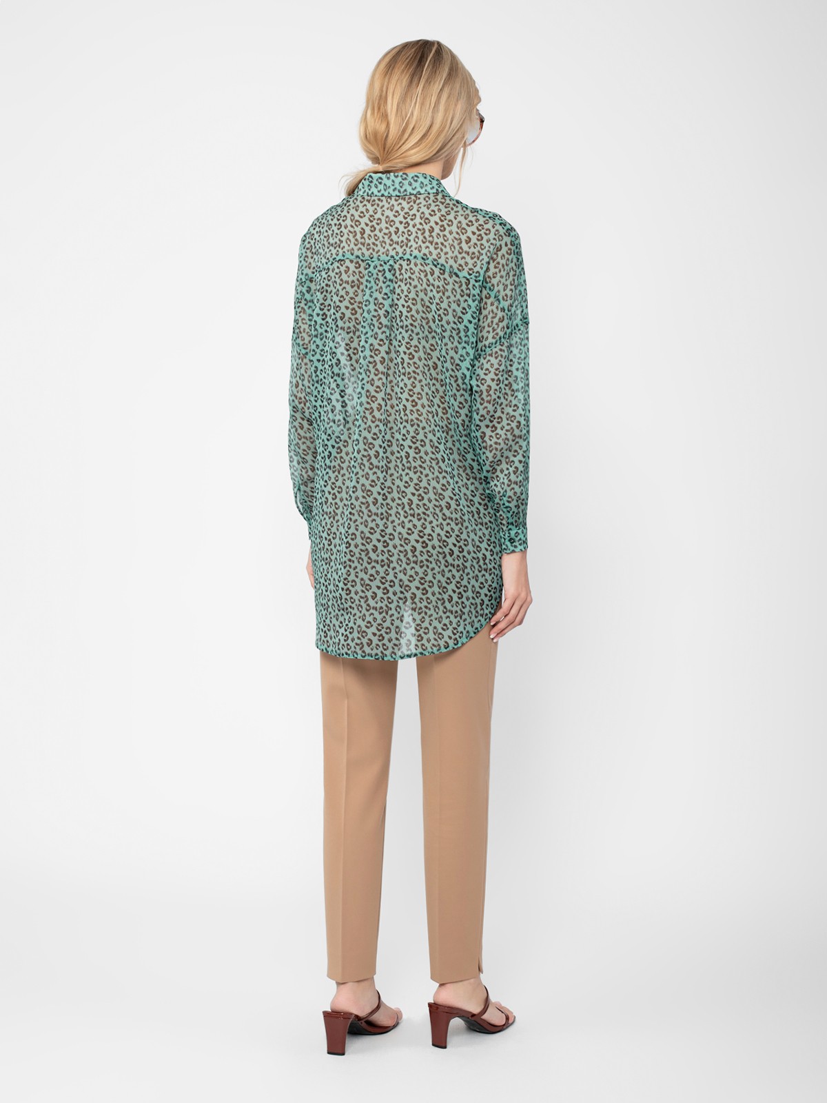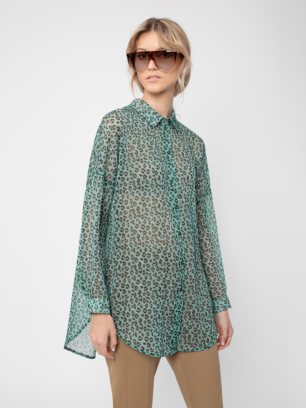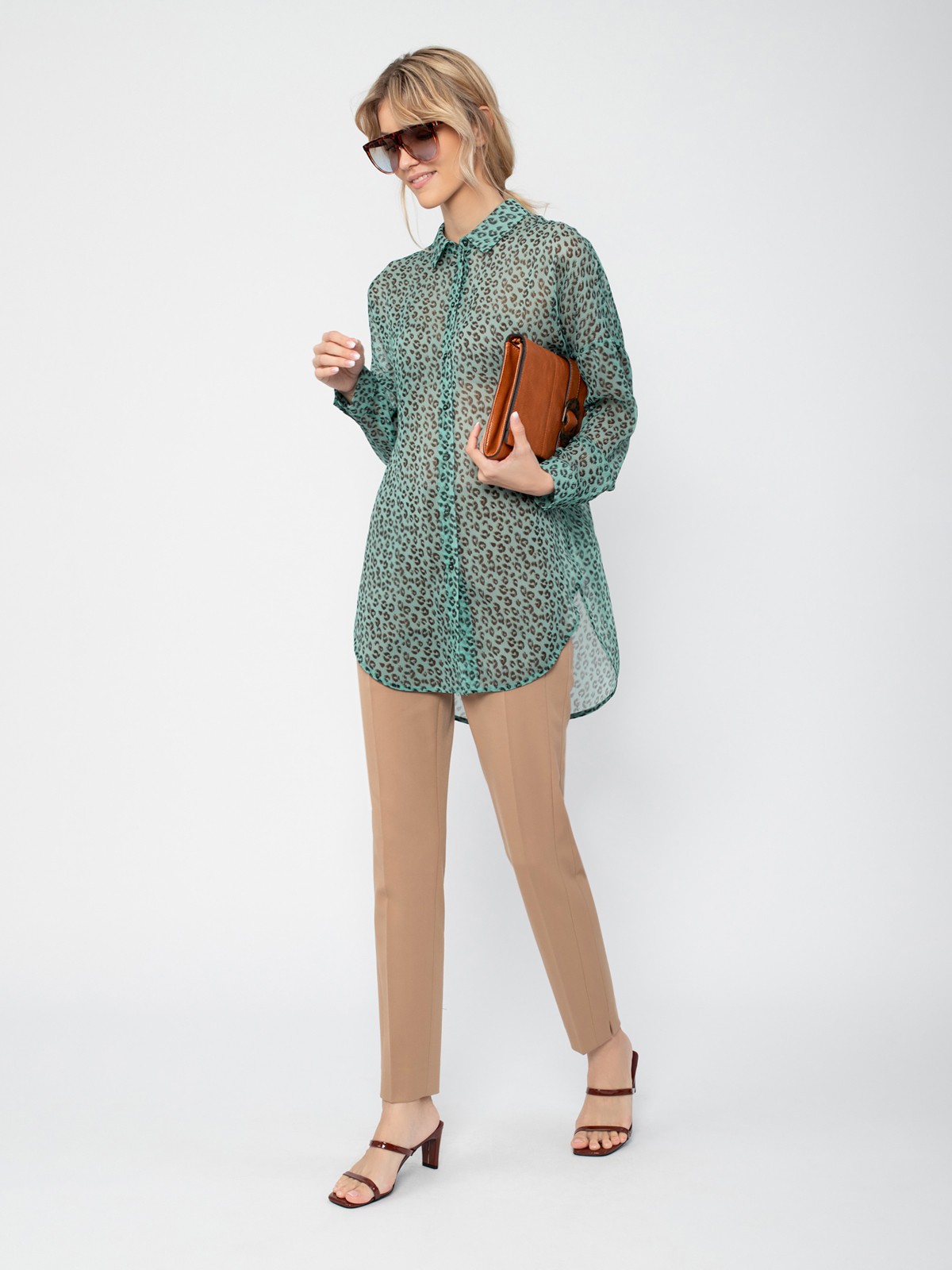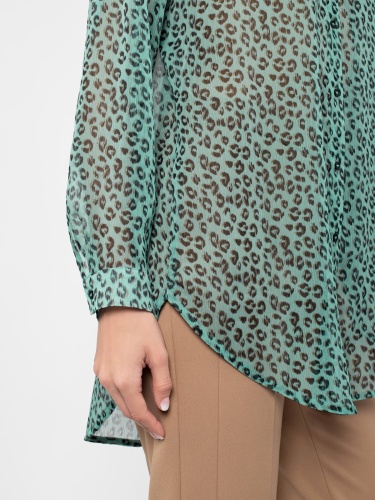 Блуза из плательной ткани в принте удлиненного прямого силуэта с классическим отложным воротником, втачным рукавом полной длины с манжетой и застежкой спереди на пуговицы. Низ изделия закругленный.