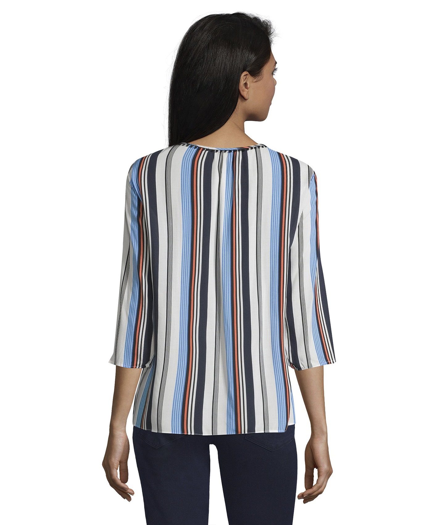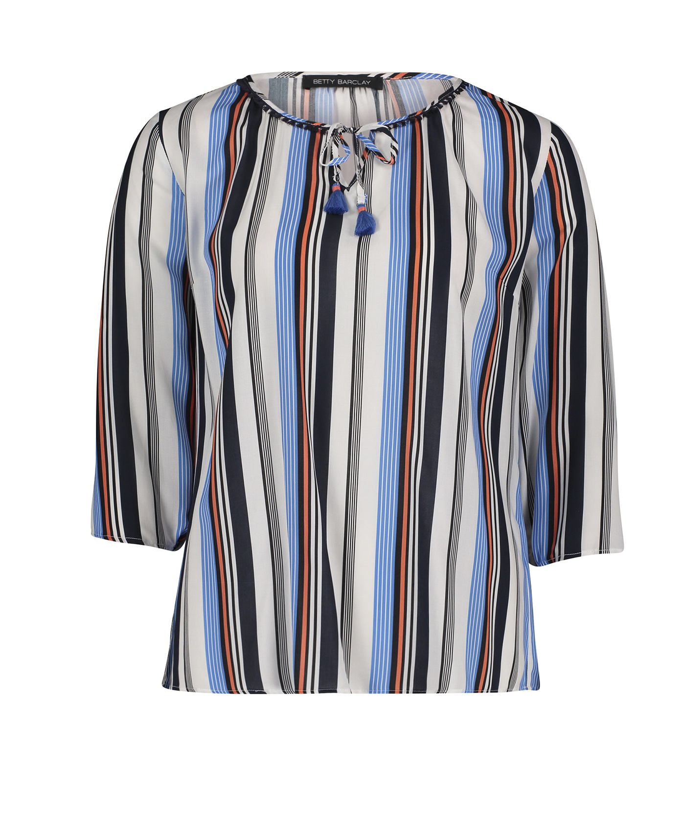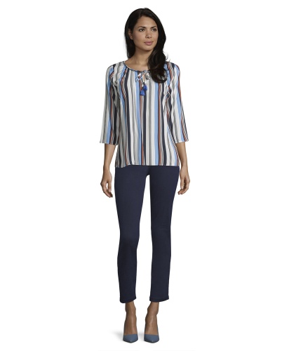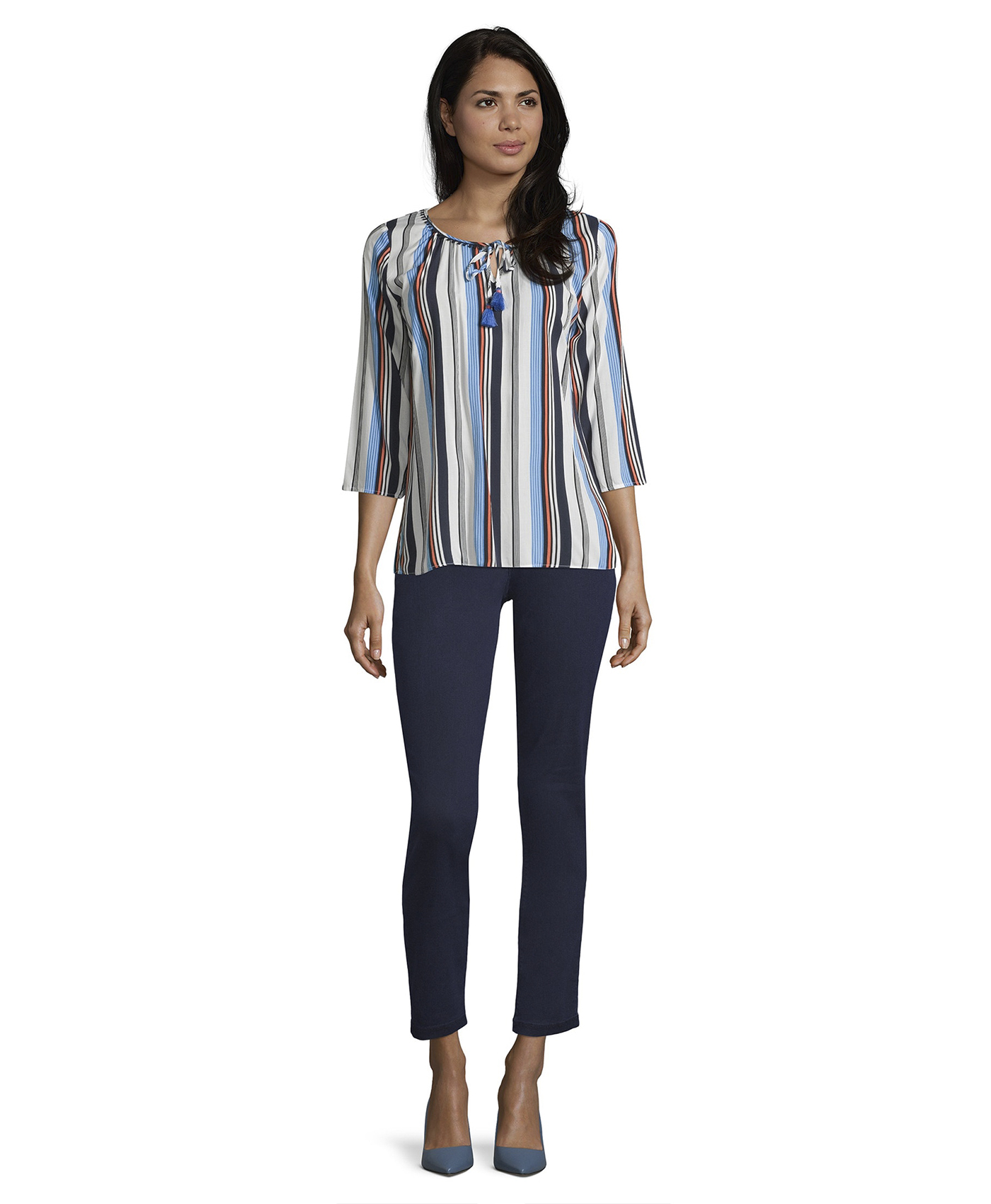 Полоска в тренде! Блуза прямого покроя. Женственный вырез горловины "замочная скважина", завязки с кисточками. Рукава 3/4. Вискозный материал приятен к телу и обеспечивает максимальный комфорт. Эта модная блуза - отличный компаньон для любого однотонного варианта низа, будь то брюки или юбка.