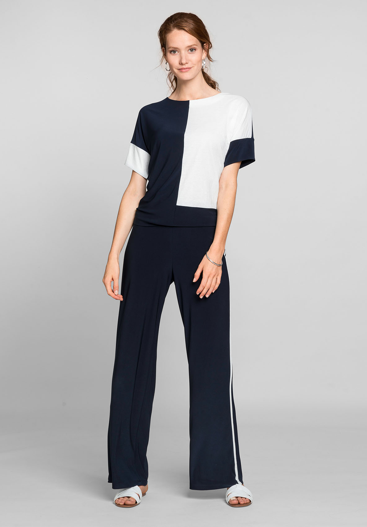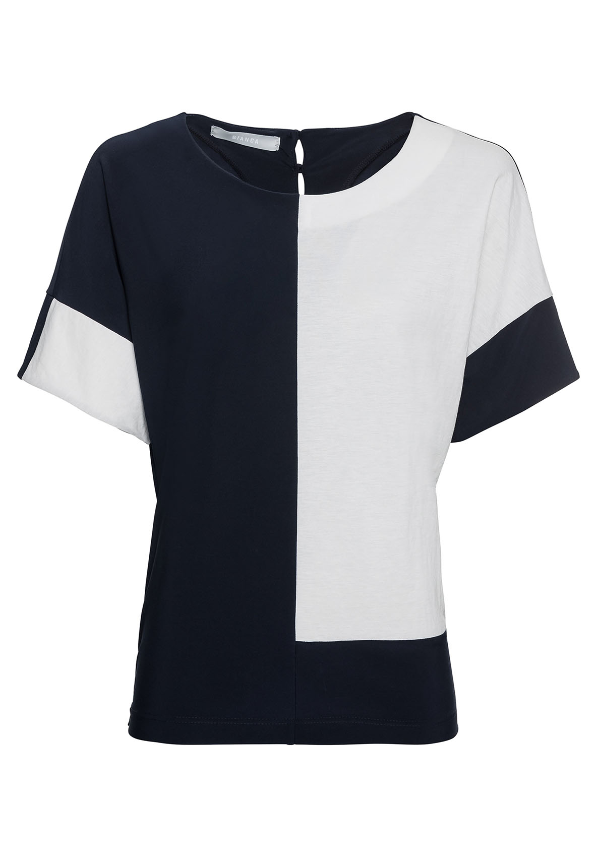 Стильная блуза Julie подходит для любого случая. Блуза обращает на себя внимание благодаря эффекту колор-блок. Длина бока регулируется кулиской. Спинка блузы выполнена из удобного однотонного трикотажа. Качественная эластичная ткань обеспечивает оптимальный комфорт. Короткий рукав с опущенным плечом, круглый вырез горловины и пуговичная планка на спинке стильно завершают образ. • в стиле колор-блок • высококачественная эластичная ткань • кулиски с лентой BIANCA по бокам изделия • круглый вырез, рукав со спущенным плечом, пуговичная планка на спинке • длина около 64 см