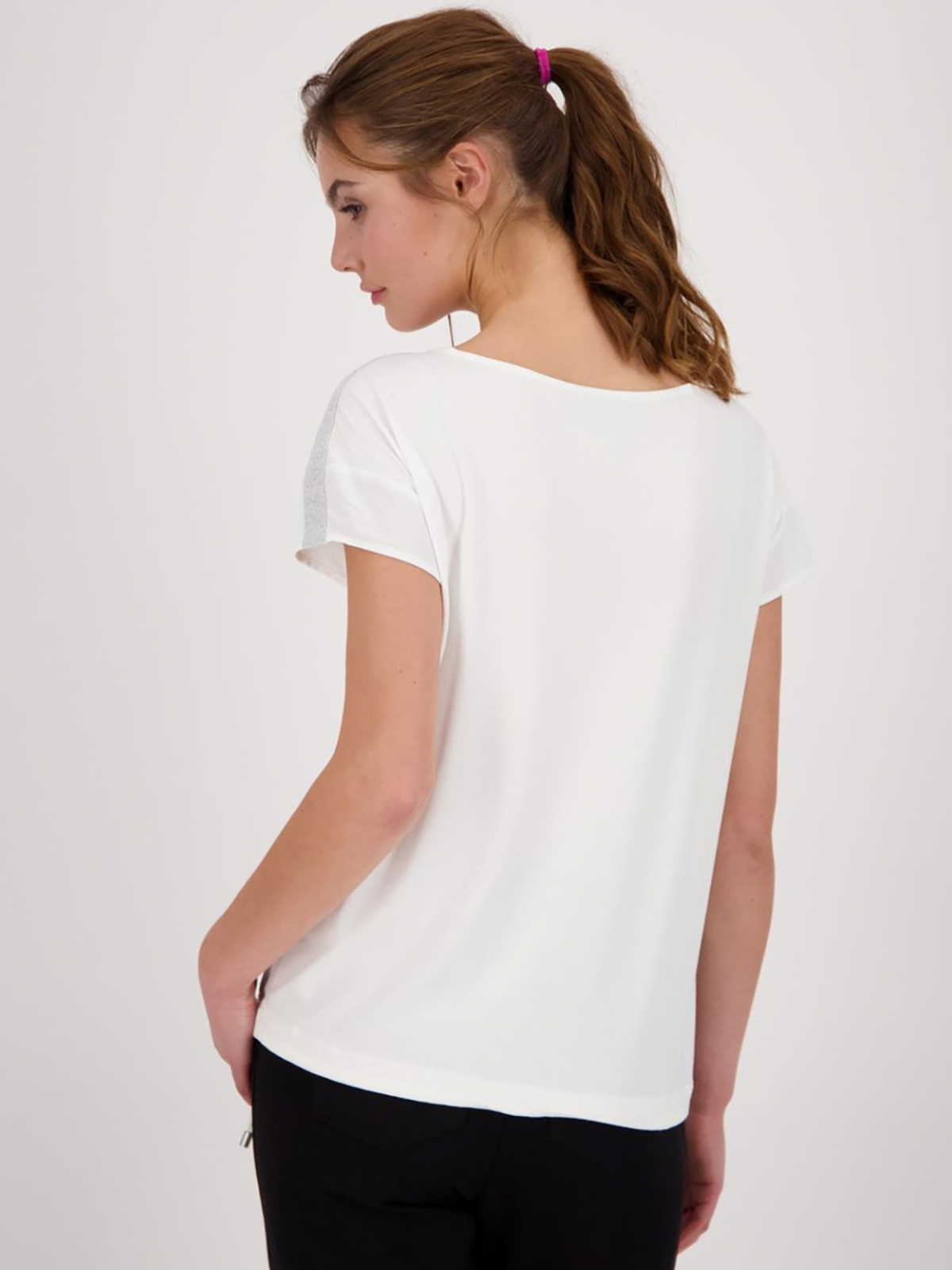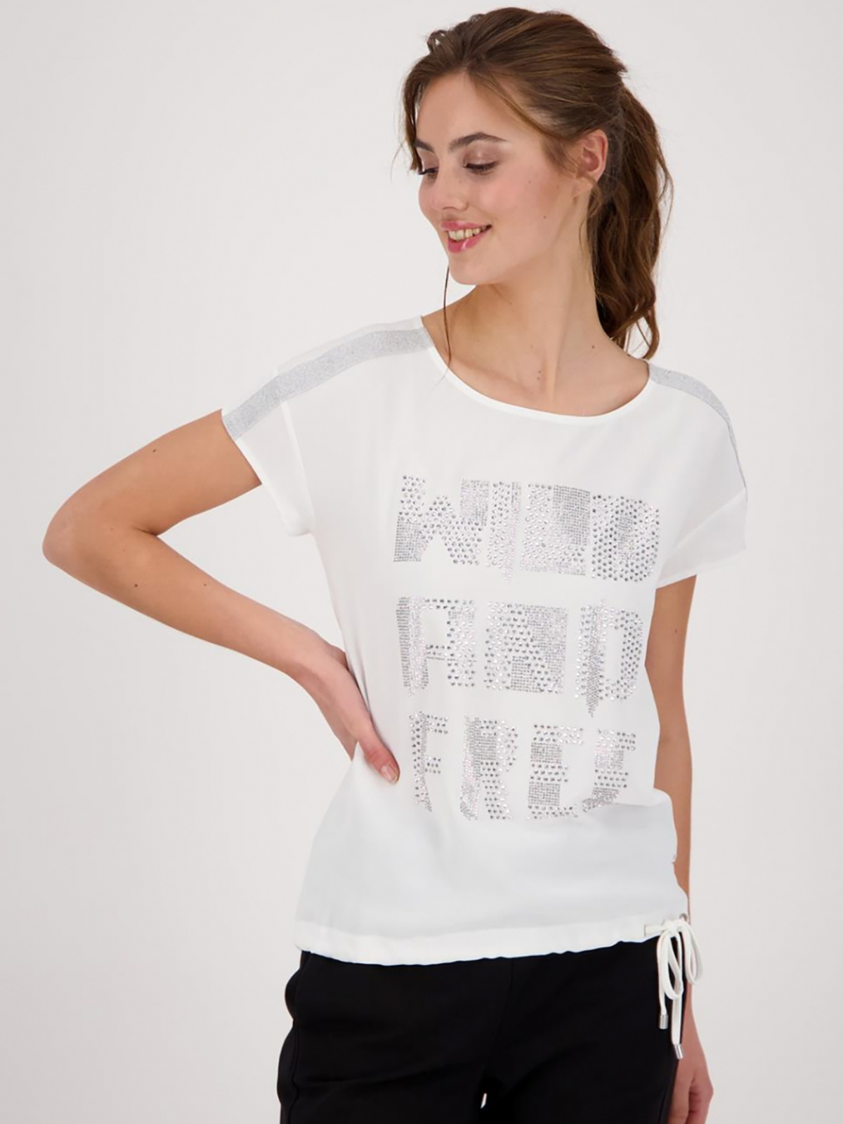 Однотонная белая блузка с принтом , украшенным стразами. Овальный вырез горловины, короткий втачной рукав. Декоративная блестящая лента по плечам блузы.