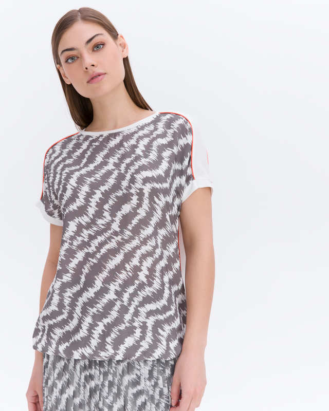 Блузка с анималистическим принтом на полочке и яркой полоской на спинке. Выполнена из эластичного материала на основе вискозы. Прямой крой. Короткий цельнокроеный рукав .