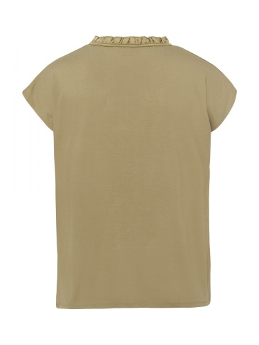 Женственная блузка-рубашка с блестящей атласной передней частью и мягкой трикотажной спинкой. -прямой крой -короткий рукав -небольшая оборка на круглом вырезе горловины -вырез и пуговица спереди -длина по размеру 42 = 62 см