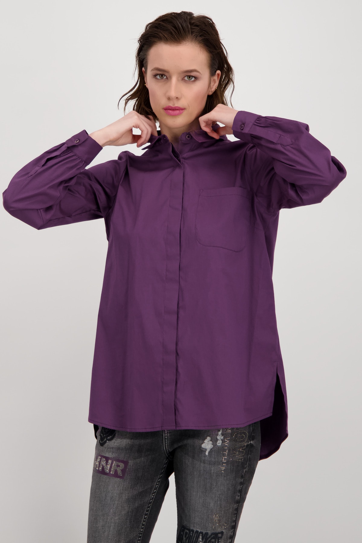 На сайте указаны российские размеры. Однотонная блуза-рубашка от monari. Стильная модель, которая вам понравится благодаря длинным рукавам с манжетами на пуговицах, длинному прямому крою с боковыми разрезами и удлиненному закругленному низу. Передняя часть имеет передний плечевой шов, накладной карман на уровне груди и планку на потайных пуговицах, а задняя часть украшена кокеткой с модной складкой. Рост модели 178 см Длина по спинке 44 размера составляет 79 см, а по переду – 74 см.