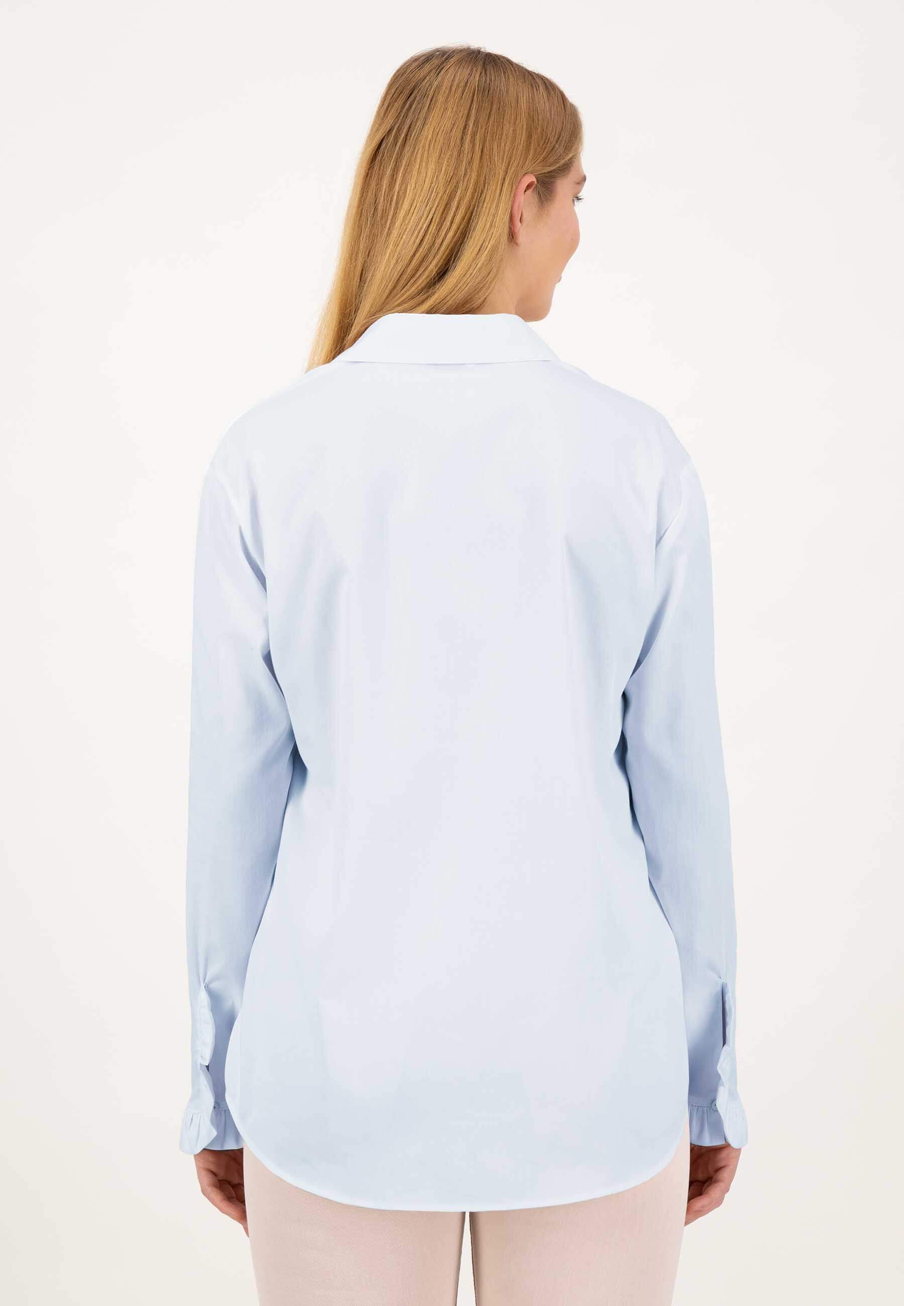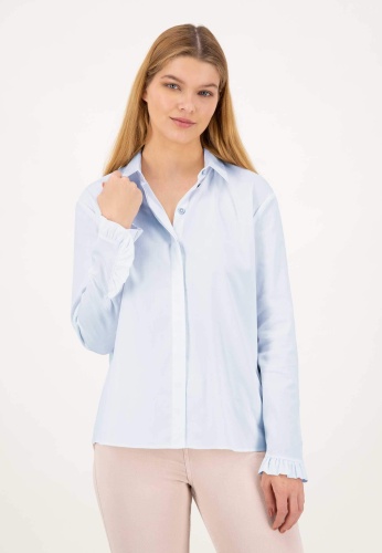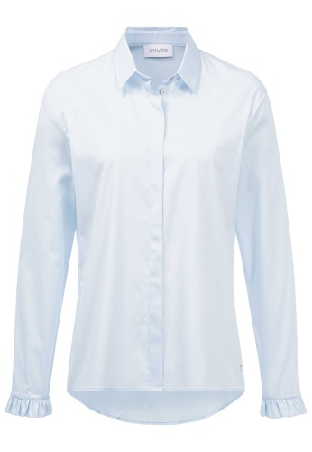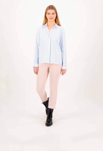 На сайте указаны российские размеры. Модная блуза с длинными рукавами и планкой на потайных пуговицах. Закругленный низ, удлиненный сзади, придает блузке струящийся легкий вид. Классический отложной воротник в сочетании с планкой на потайных пуговицах. Наша модель ростом 177 см. Измерения для 44 размера: Окружность груди: 106 см Талия: 106 см Бедра: 114 см Длина по спинке: 72 см. Длина рукава: 60 см.