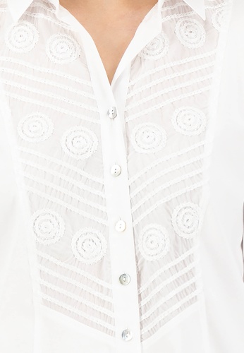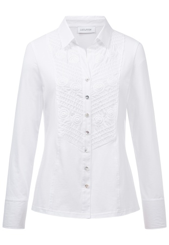 На сайте указаны российские размеры. Вышитая блузка из смесового хлопка с перламутровыми пуговицами. Модель ростом 177 см. Измерения для 44 размера: Окружность груди: 99 см Талия: 94 см Бедра: 106 см Длина по спинке: 62 см. Длина рукава: 62 см.