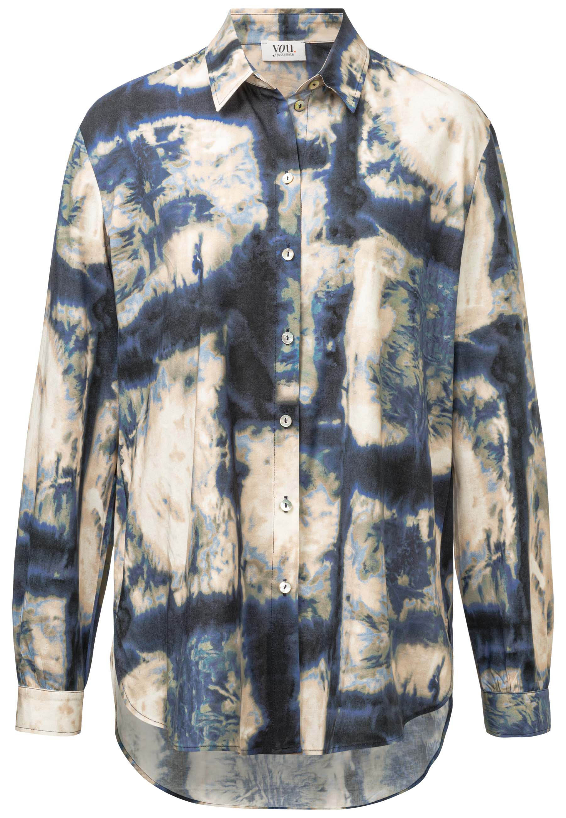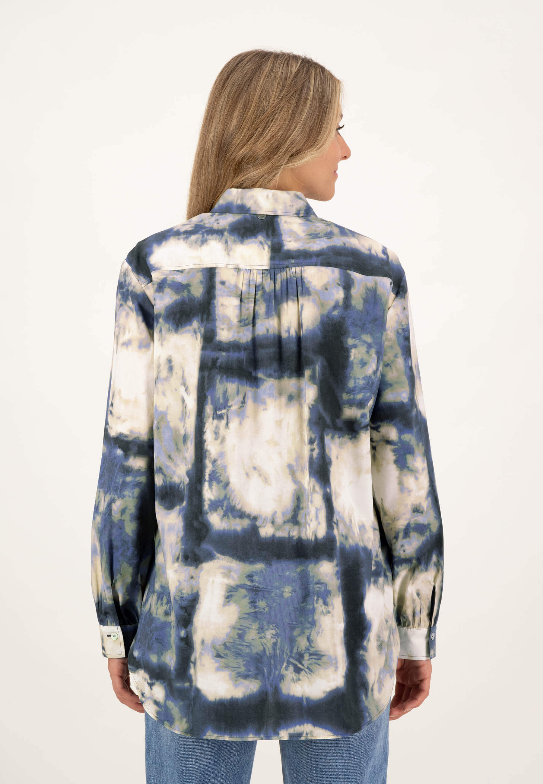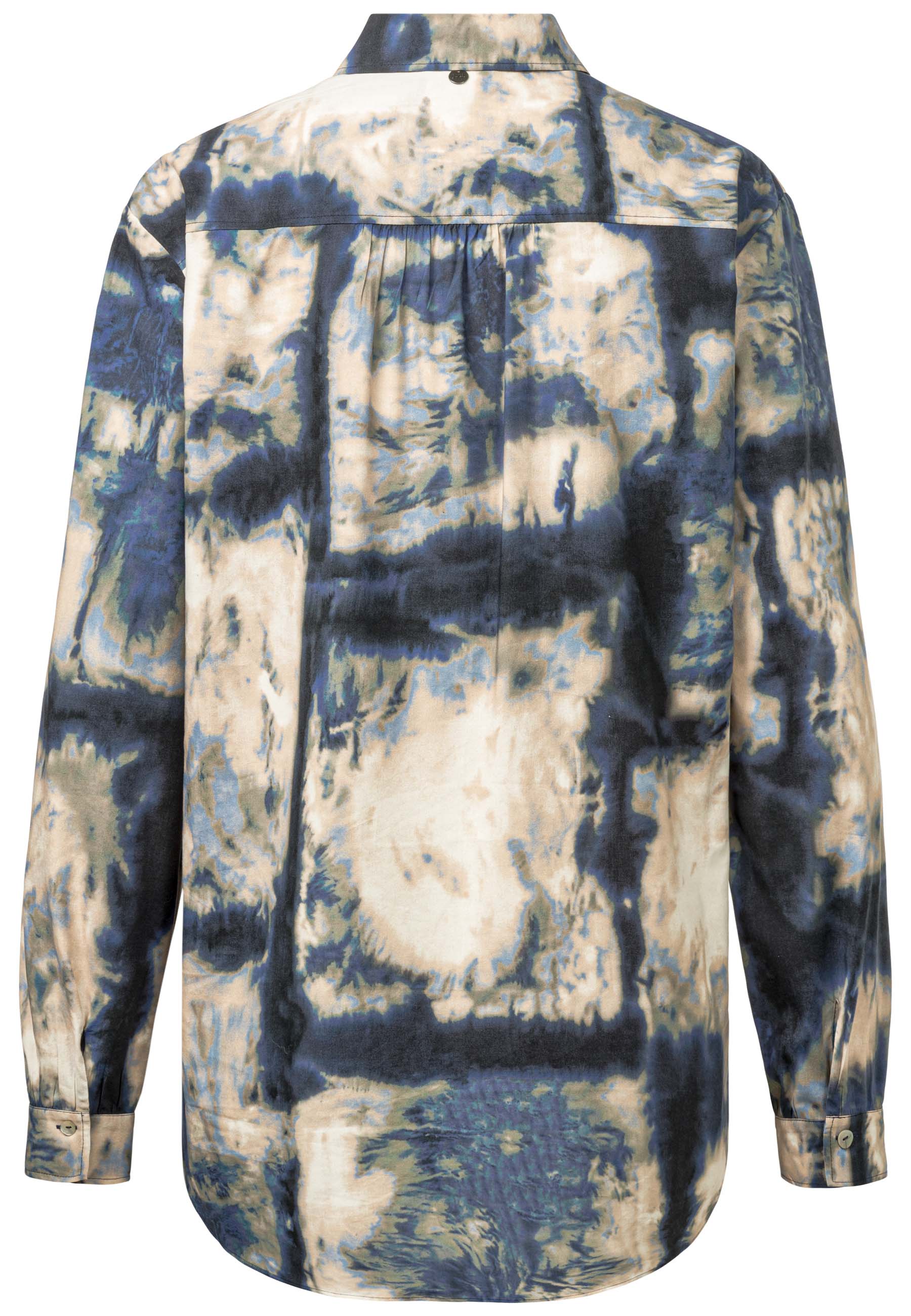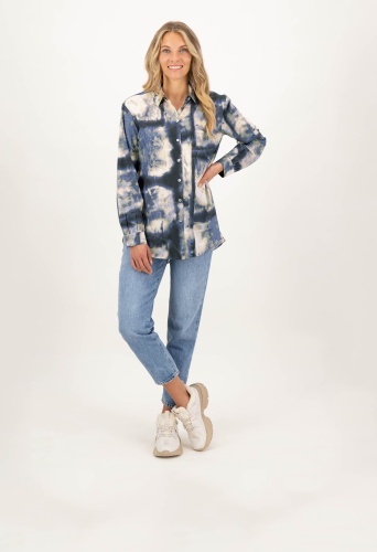 На сайте указаны российские размеры. Экологичная блуза-рубашка синего цвета с принтом тай-дай по всей поверхности. Сделано из экологически чистых материалов и "Сделано в Европе" - это только два аргумента в пользу этой блузки. Он впечатляет не только своим привлекательным принтом по всей поверхности, но и интересными деталями, такими как гофрированный низ рукава, двухъярусный закругленный низ или блестящие перламутровые пуговицы. Наша модель ростом 177 см. Измерения для 44 размера: Окружность груди: 112 см Талия: 110 см Бедра: 119 см Длина спинки: 78 см. Длина рукава: 60 см.