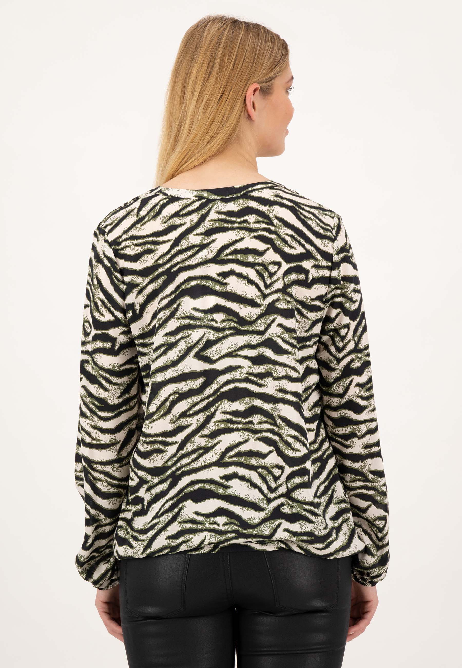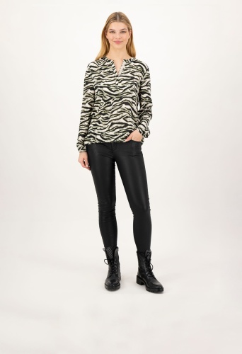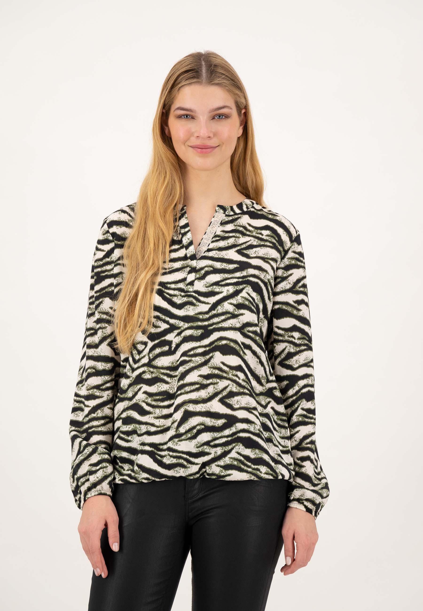 На сайте указаны российские размеры. Блузка с длинными рукавами из тонкой вискозы с анималистичным принтом. Животный образ никогда не выходит из моды. Благодаря каучуковым краям вискозная блуза всегда выглядит хорошо сидящей и спортивной. Короткая планка на пуговицах с изящно декорированной вставкой из люрекса и стразов делает эту блузку на пуговицах стильной и удобной в носке. Наша модель ростом 177 см. Измерения для 44 размера: Окружность груди: 104 см Талия: 104 см Бедра: 113 см Длина спинки: 65 см Длина рукава: 62 см