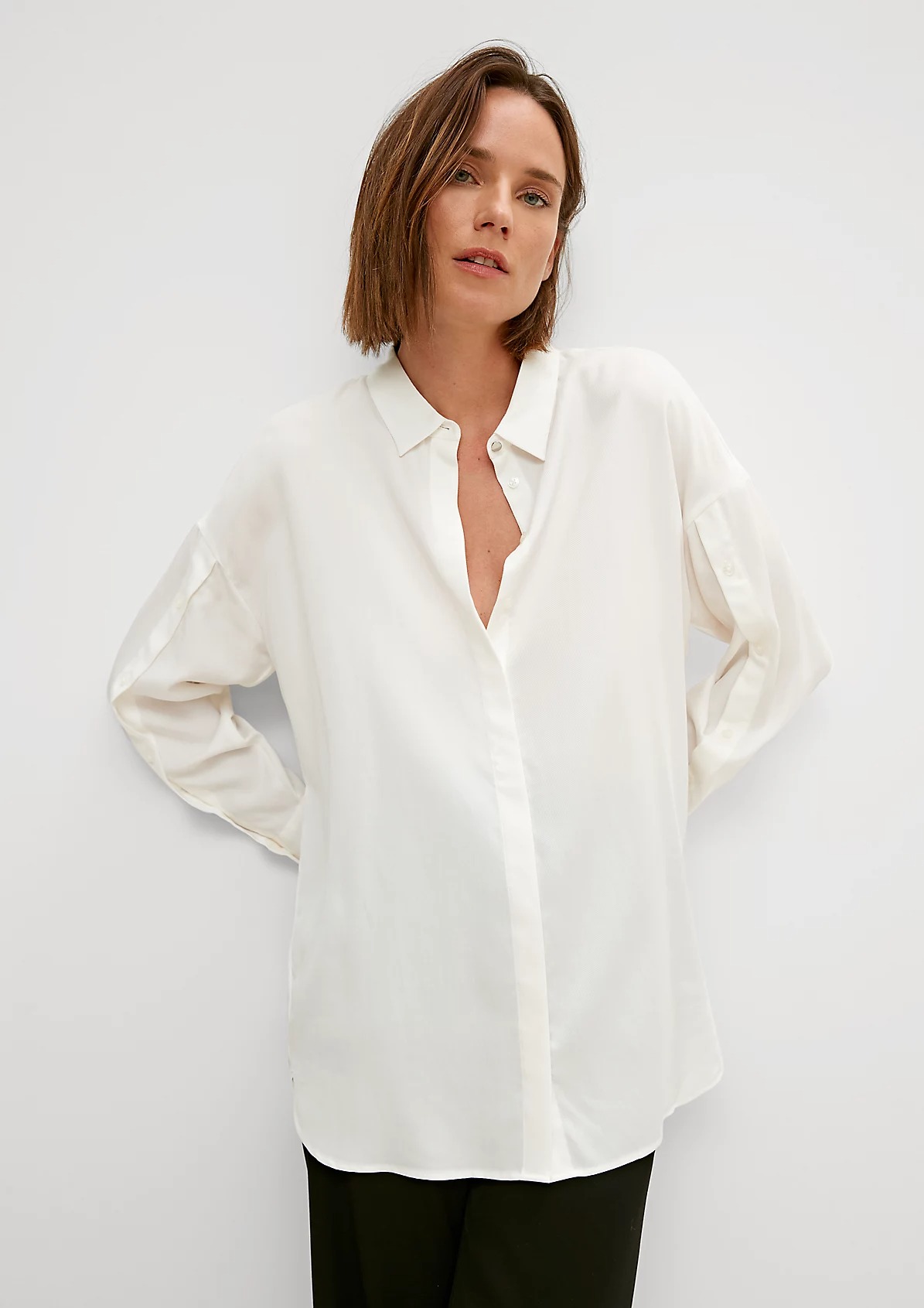 На сайте указаны российские размеры. Легкая классическая блуза с закругленным низом и разрезами сбоку. Застежка: планка с потайными пуговицами. Рукав: манжеты.
