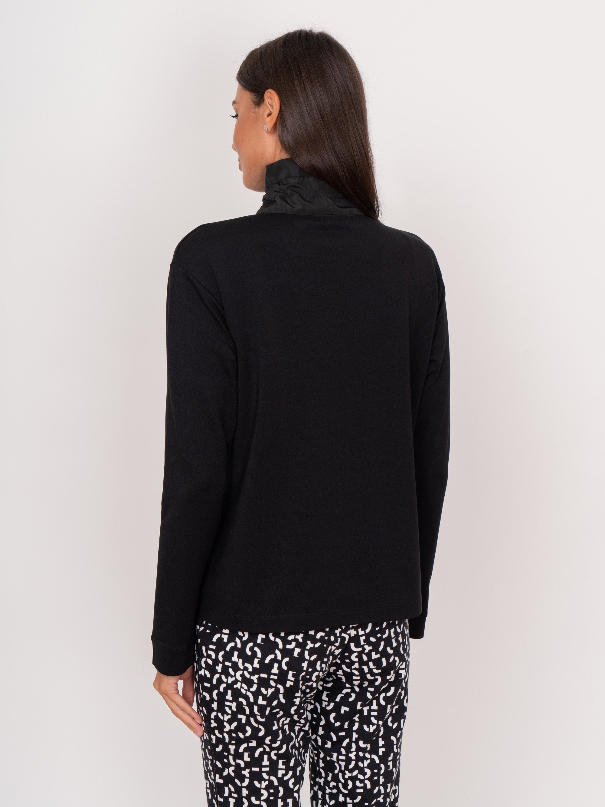 На сайте указаны российские размеры. Трикотажный черный джемпер, с воротником-стойка из текстиля на молнии и завязках, с длинным рукавом, с полоской, с абстрактным белым рисунком. Рости модели: 175 см. Длина блузы: 58 см.