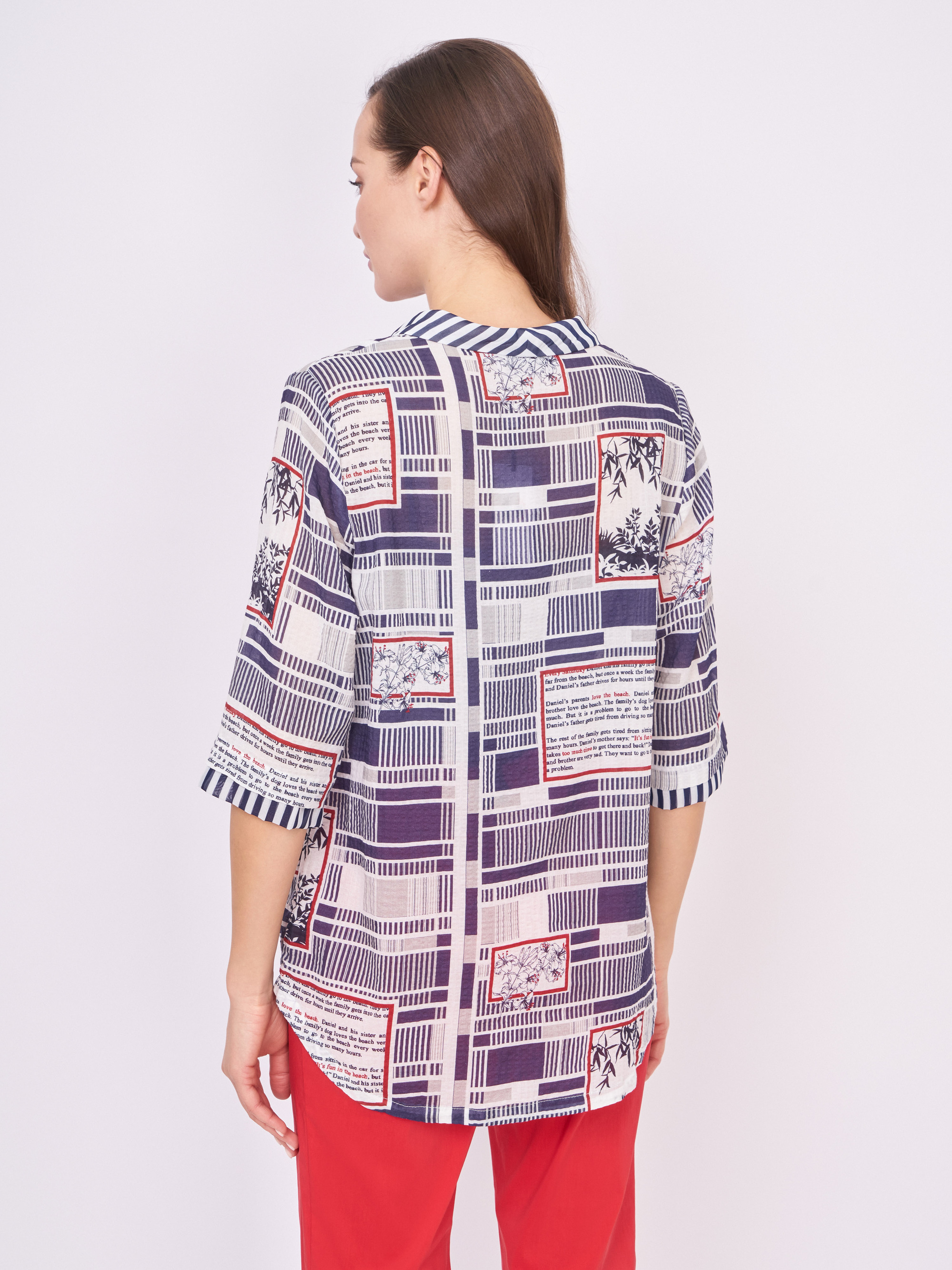 На сайте указаны российские размеры. Бело-синяя блузка трапеция на пуговицах, с отложным воротником, с красными вставками, с геометрическим, с цветочным рисунком и надписями. Длина по спинке: 72 см. Рост модели: 177 см.
