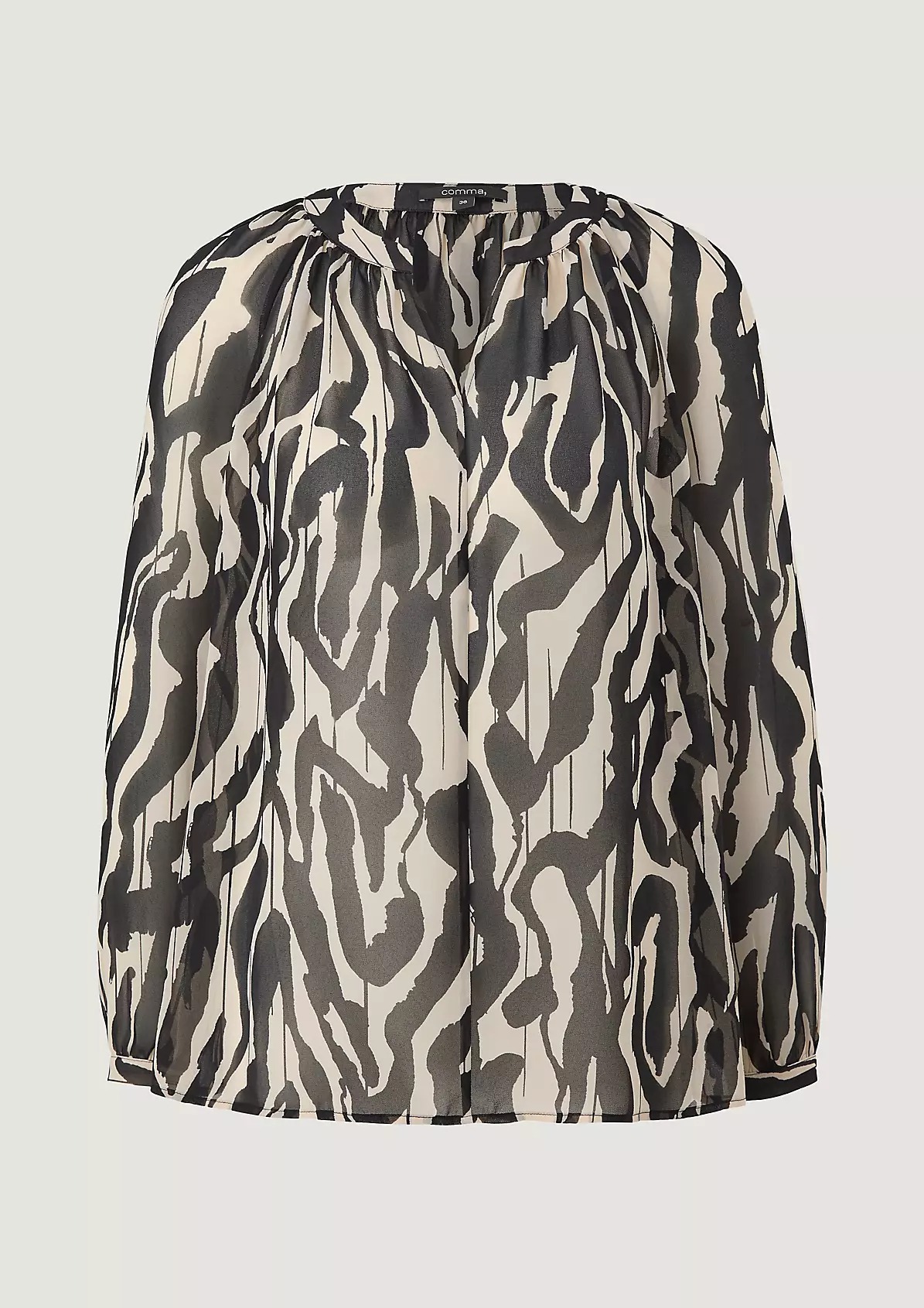На сайте указаны российские размеры. Легкая блуза с анималистичным принтом и V-образным вырезом горловины. Длина спины 64 см в размере 42 Рост модели 177 см.