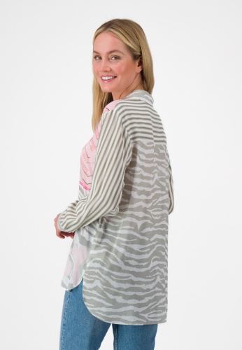 На сайте указаны российские размеры. Элегантная и в то же время повседневная блуза с рубашечным воротником и модным сплошным принтом станет базовым элементом вашего следующего любимого образа. Наш любимый рисунок сезона с сочетанием надписей, полосок и зебры особенно хорошо смотрится на мягкой вискозе высокого качества. Длина по спинке: 76 см. Рост модели: 177 см.