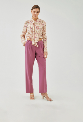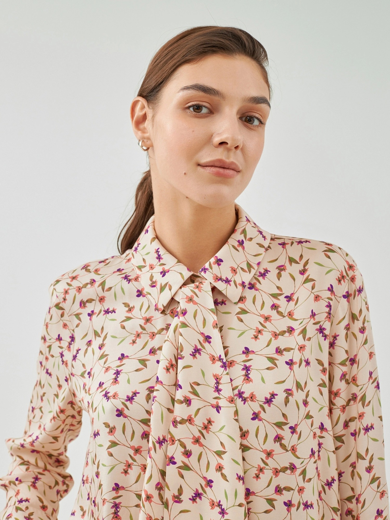 На сайте указаны российские размеры. Романтичная прямая блуза из вискозной ткани в цветочном принте. С отложным воротником и шарфом-галстуком. Составит идеальный романтичный комплект с юбкой из этой же ткани. Рост модели 175 см.