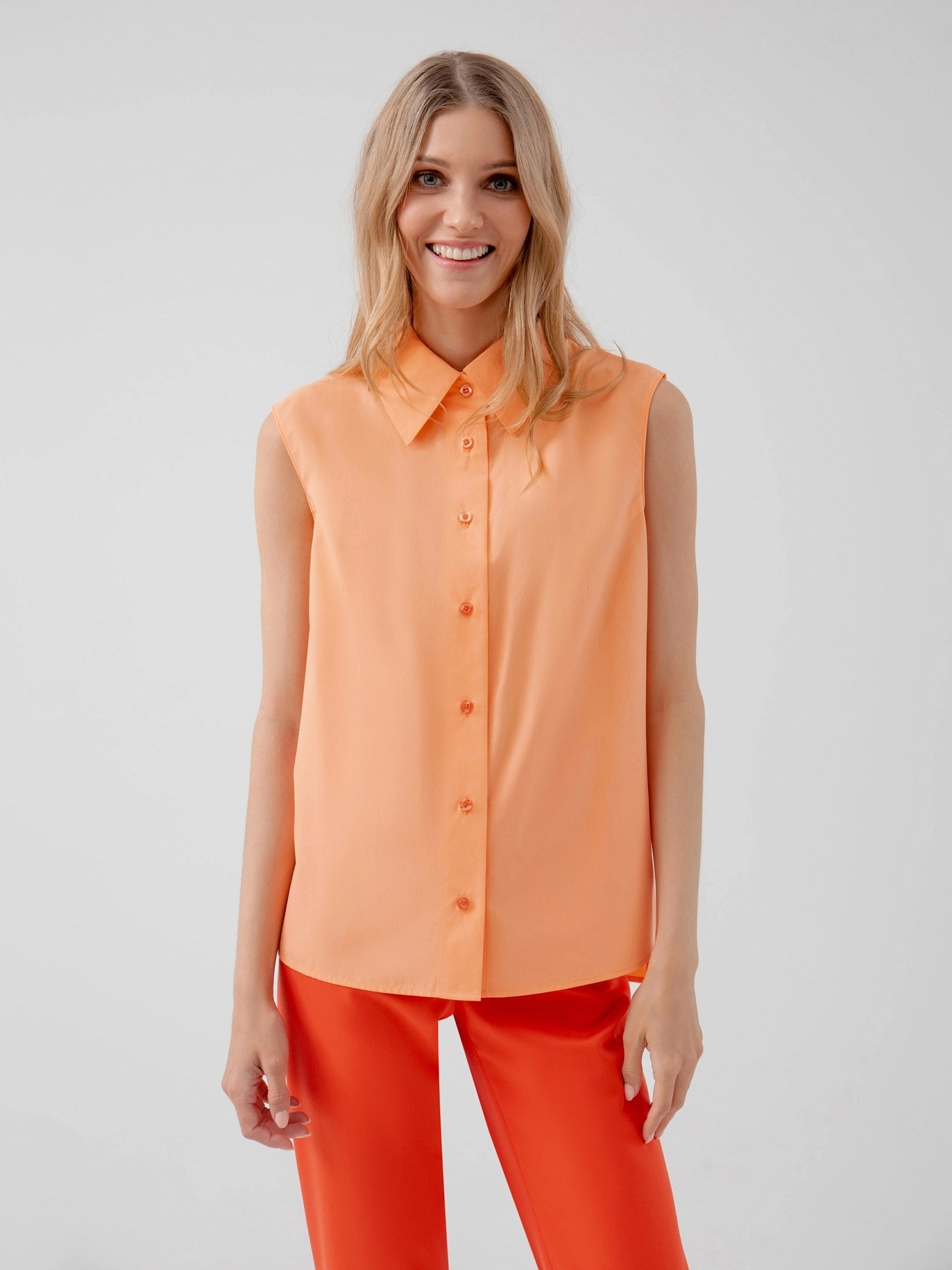 На сайте указаны российские размеры. Блуза прямого силуэта без рукавов и разрезами по бокам, имеет классический отложной воротник. Выполненная из 100% хлопка в персиковым цвете. Рост модели 175 см.