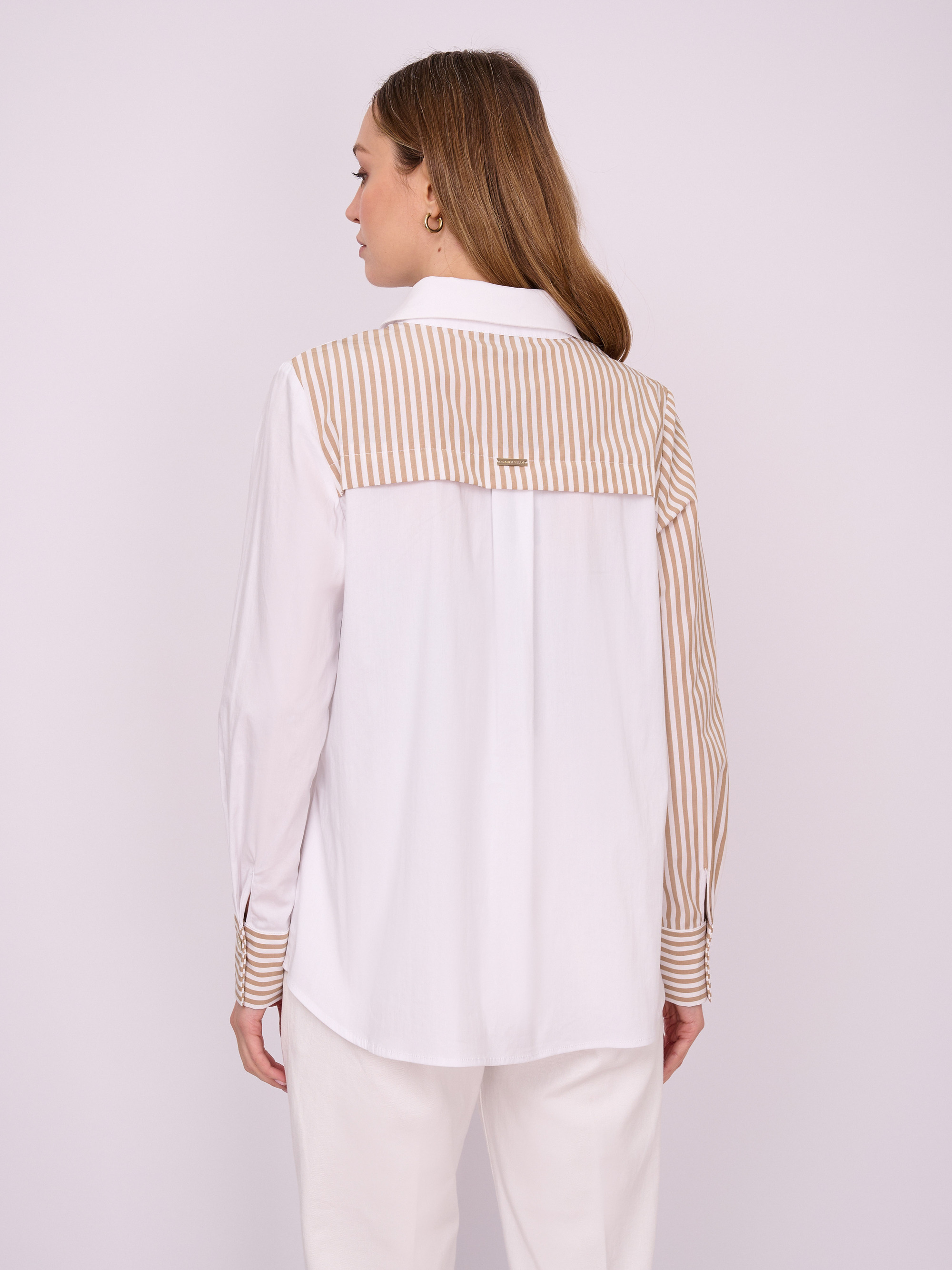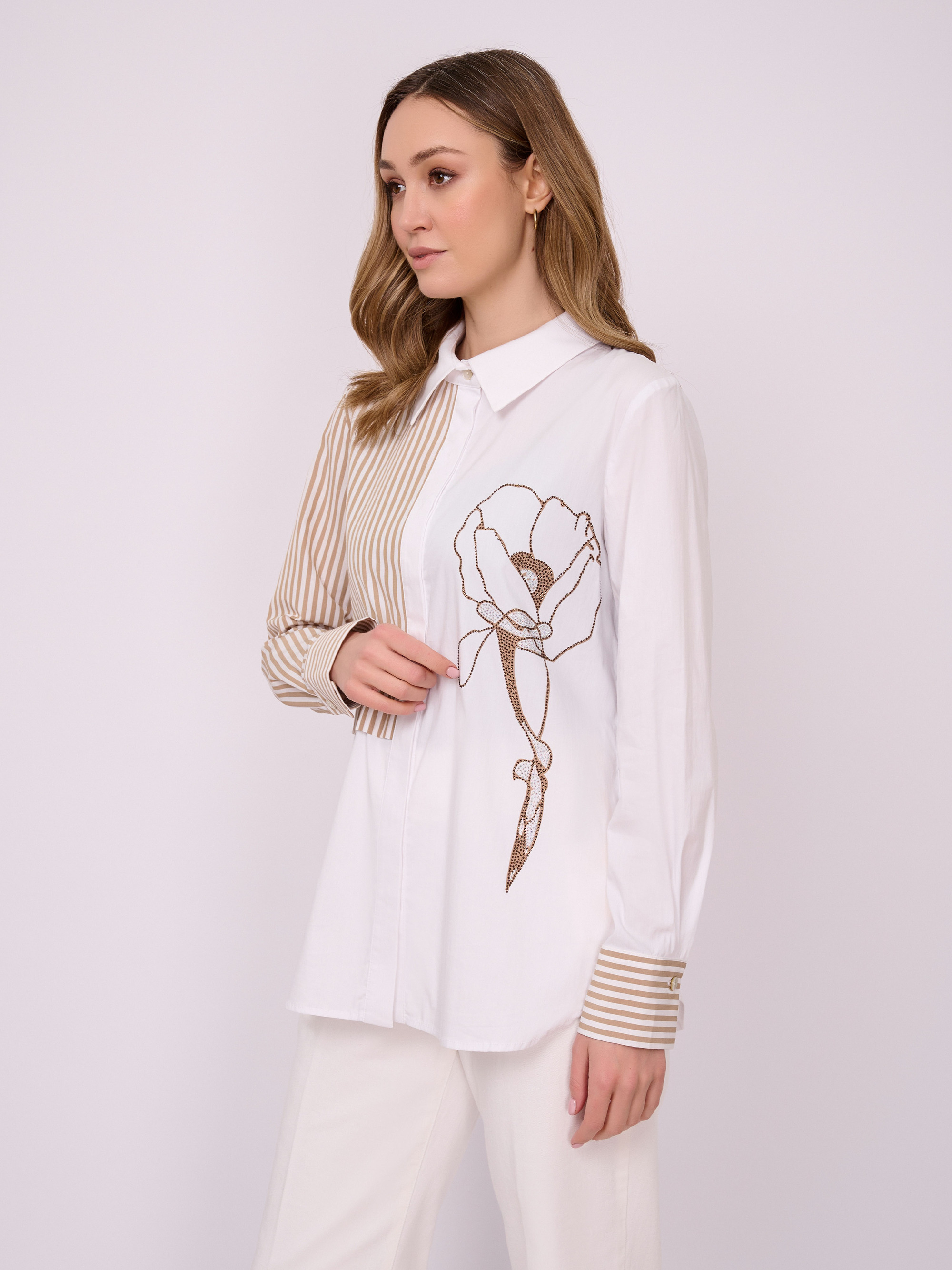 На сайте указаны российские размеры. Хлопковая блуза рубашечного покроя на пуговицах с длинными рукавами с манжетами, украшенная стразами. На спинке изделия – кокетка и бантовая складка. Длина по спинке: 67 см. Рост модели 175 см.