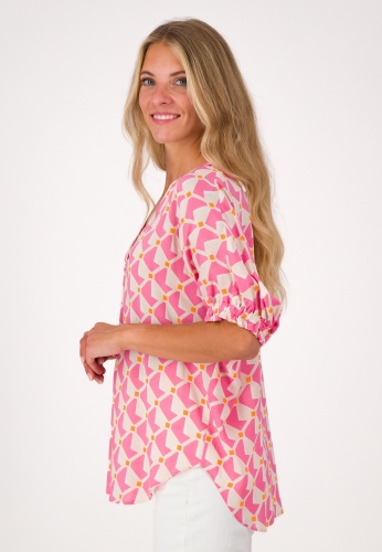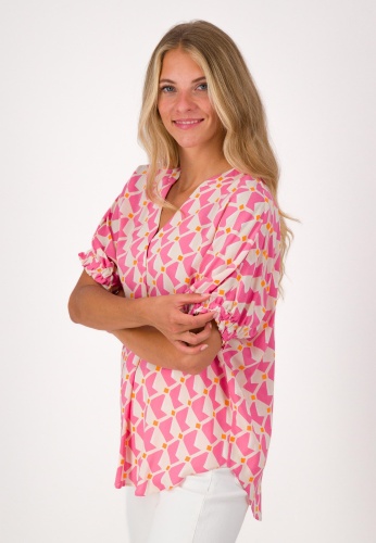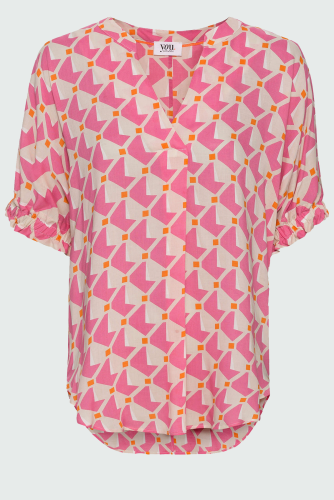 Блузка-рубашка из нежной вискозы – настоящий фаворит лета. Геометрический рисунок блузки является настоящей изюминкой и придает любому наряду модный и непринужденный оттенок. Эластичная лента на рукавах придает блузке игривый вид и обеспечивает удобную посадку, а удлиненная спинка обеспечивает идеальную посадку.