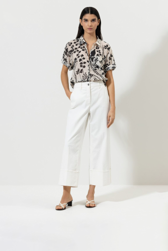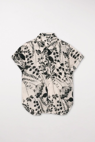 Рубашка повседневного кроя из легкой хлопковой вуали с эксклюзивным графическим абстрактным рисунком в виде цветов и травы и планкой на пуговицах во всю длину. Короткие рукава имеют фиксированный отворот, а подол закруглен.
