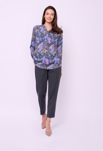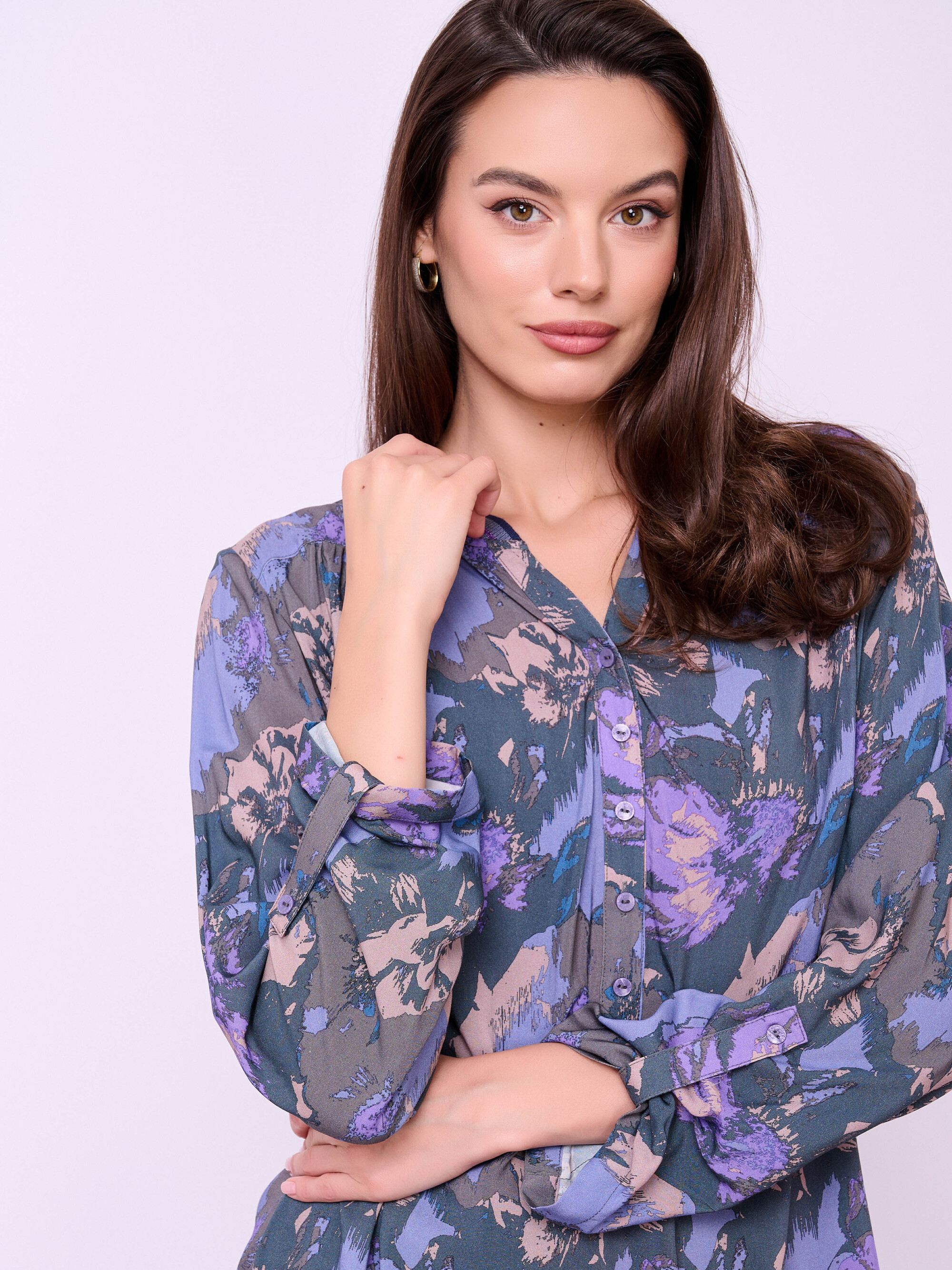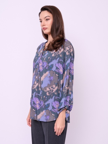 Блуза из вискозы с V-образным вырезом на пуговицах, трикотажным воротником-стойкой, длинными рукавами на хлястиках, кокеткой и сборкой на спинке. Длина по спинке: 67 см.