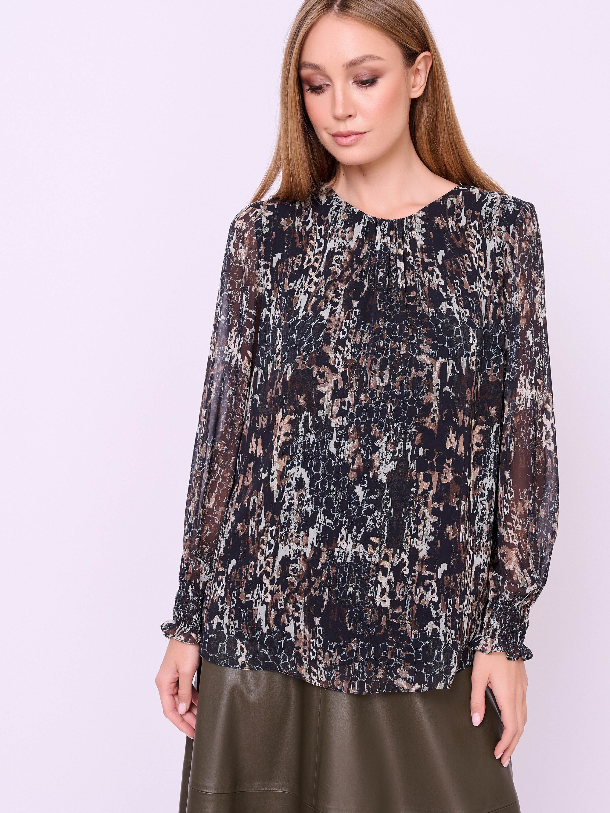 Блуза из шифона с абстрактным рисунком свободного покроя с округлой горловиной, длинными рукавами на резинке. Длина по спинке: 66 см.