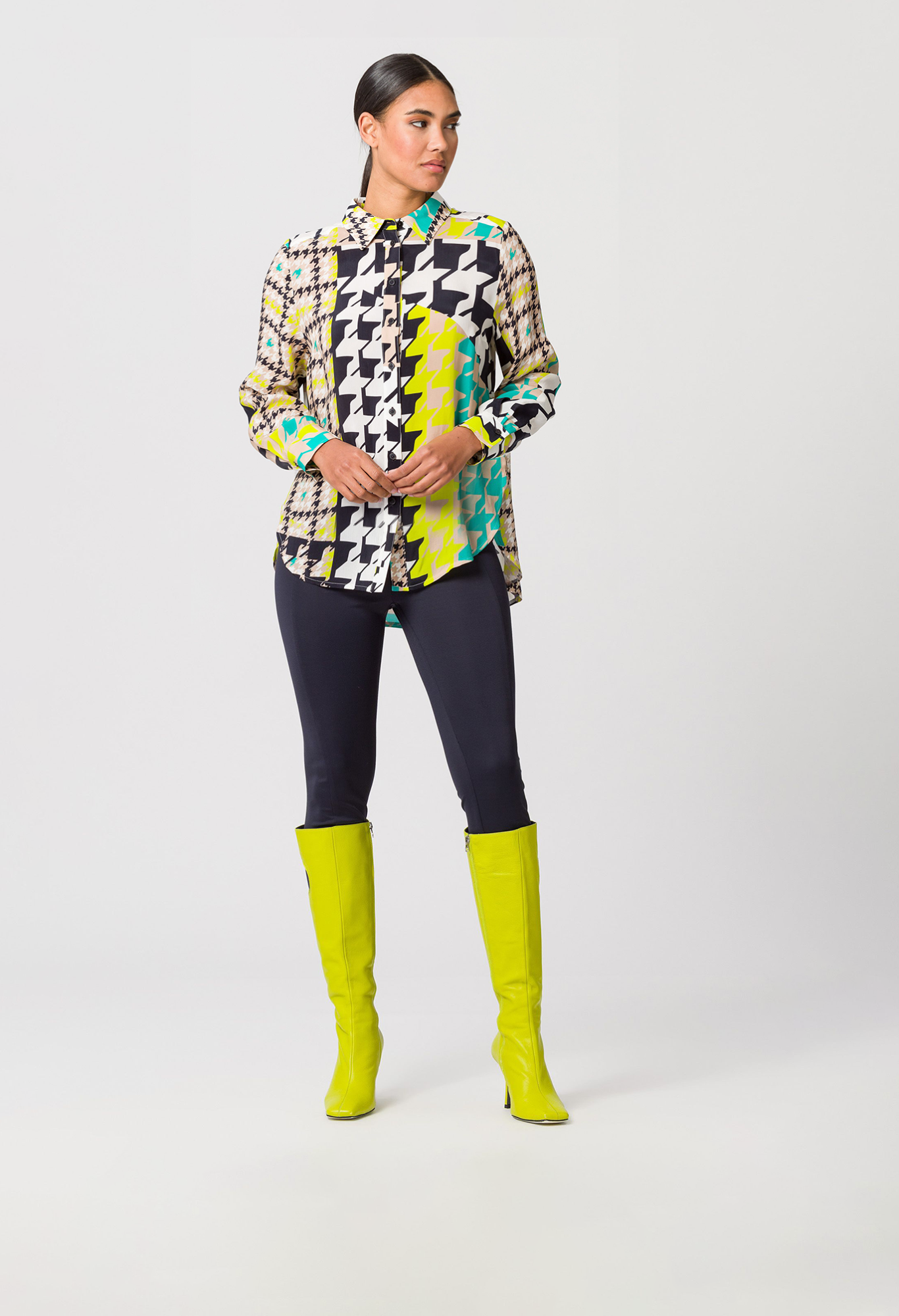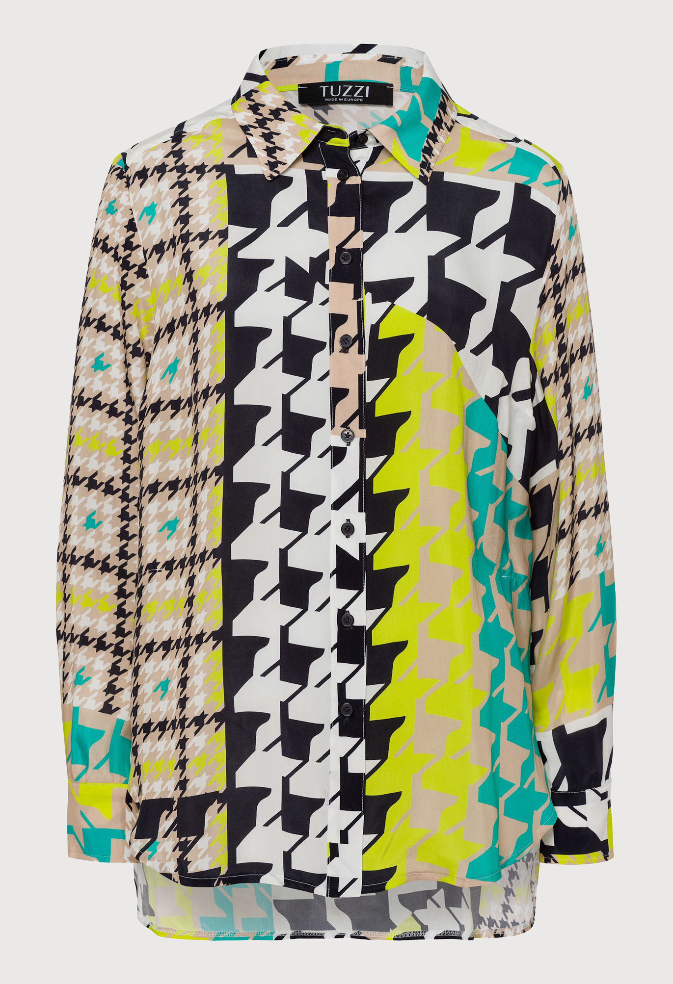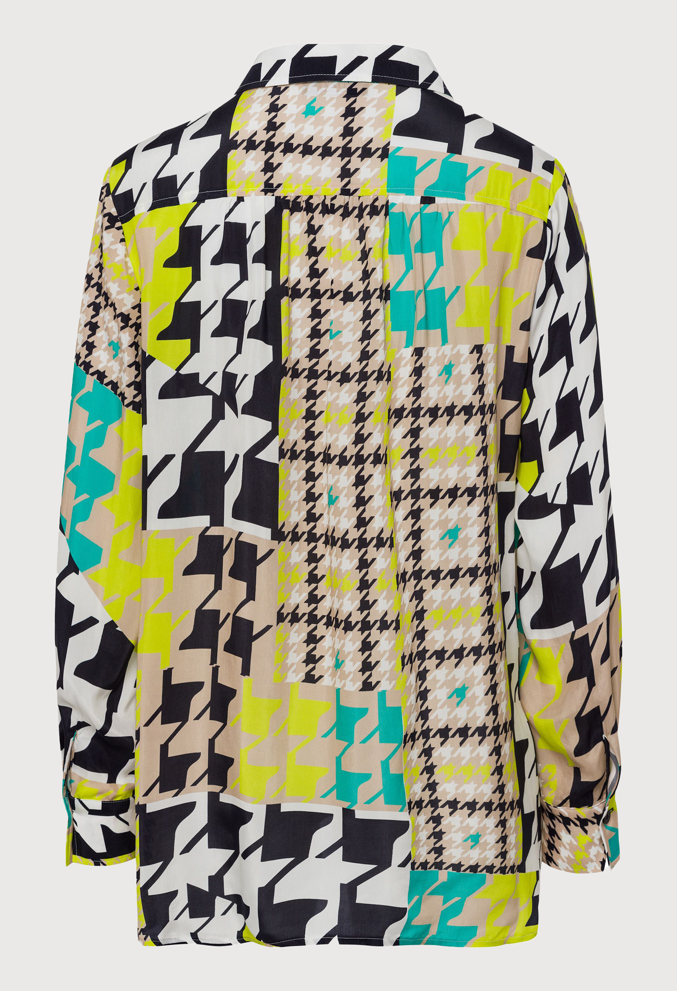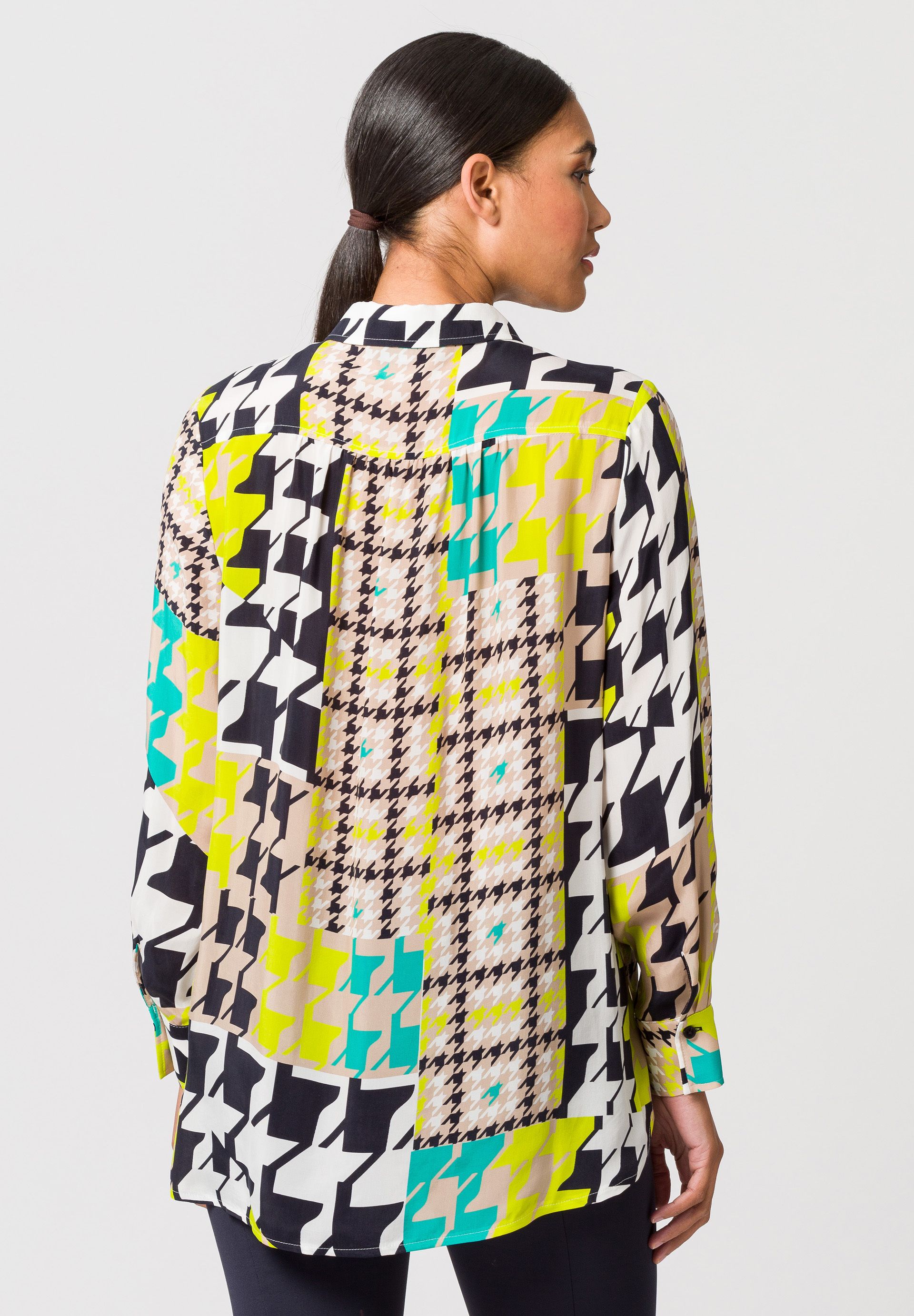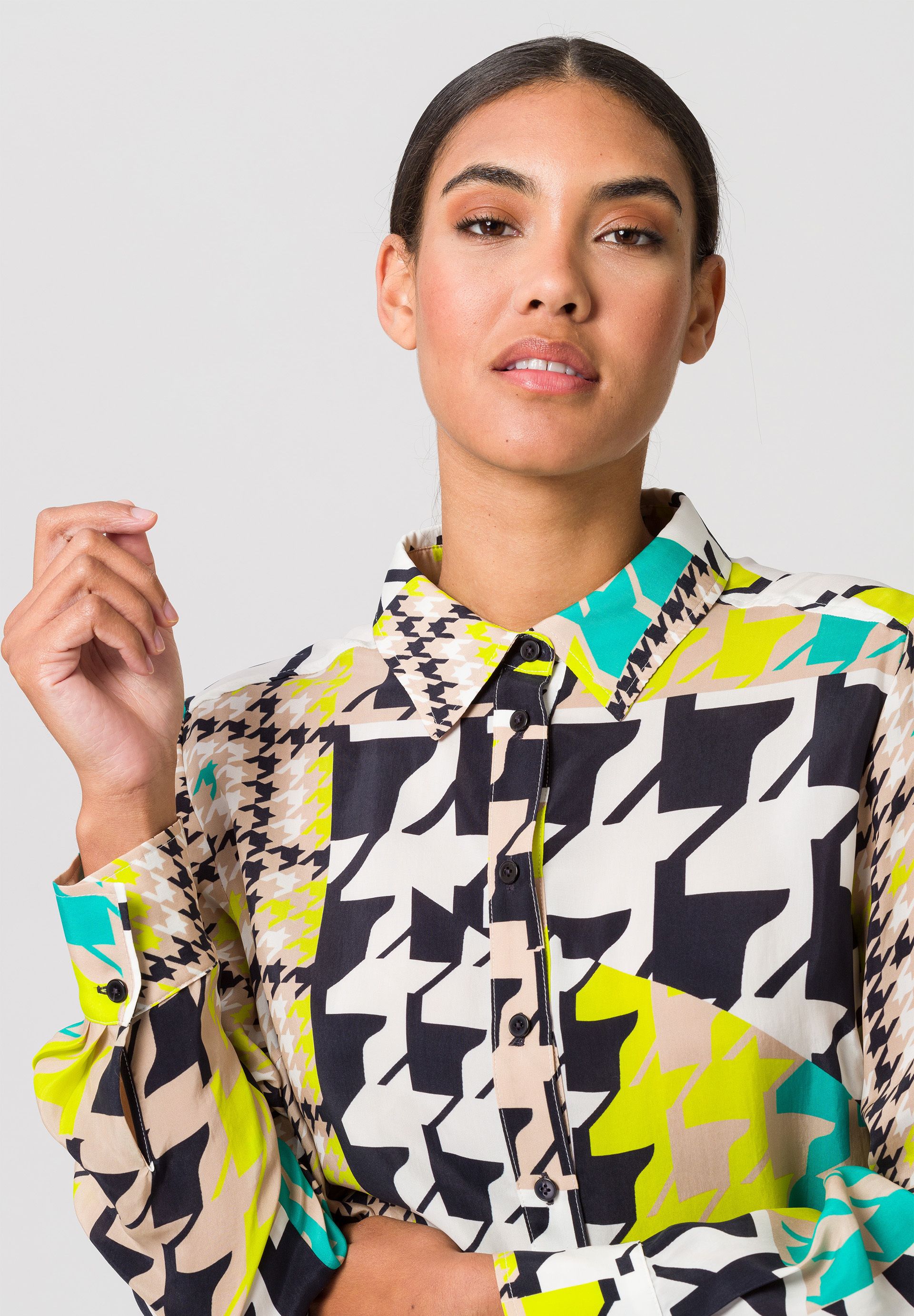 Длинная женская блузка с классическим рубашечным воротником. Классический узор «гусиные лапки» в своей привлекательной новой интерпретации делает шаг в этом сезоне и придает этой длинной блузке повседневного кроя статус высокой моды. Индивидуальный дизайн закругленного края блузки, немного длиннее сзади и с высоким разрезом, хорошо сочетается с модным принтом по всей поверхности. Гладкая ткань купро придает блузе элегантный и блестящий вид.
