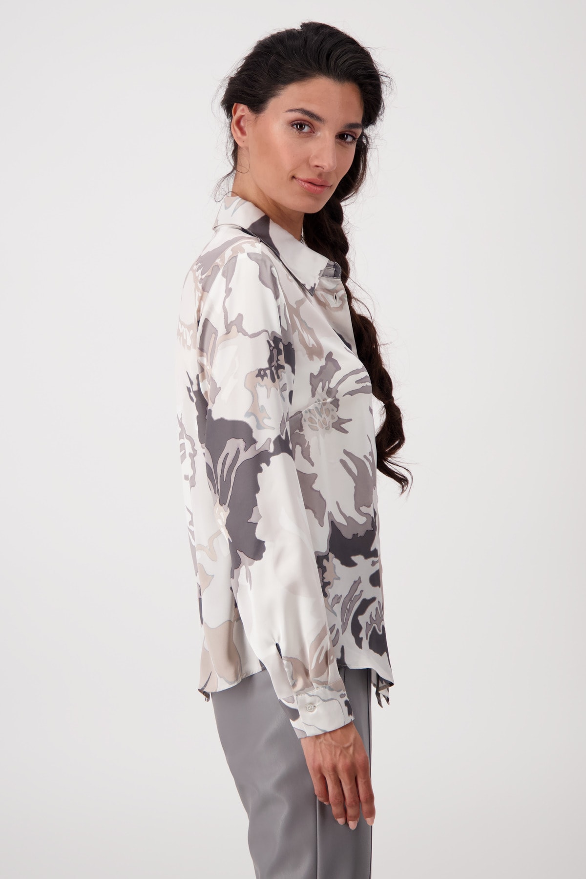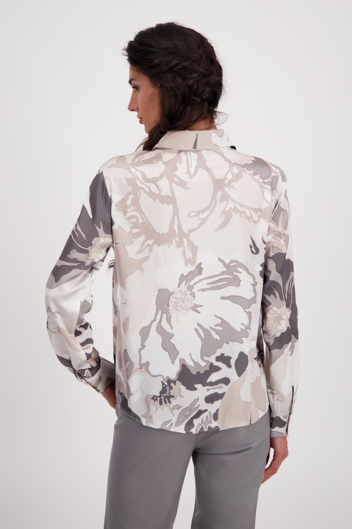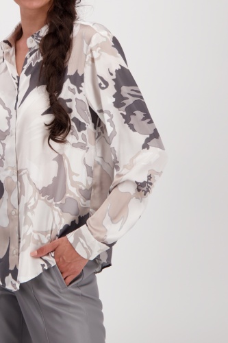 Атласная блузка с цветочным принтом впечатляет такими классическими деталями, как манжета на подоле рукава. Длина 44-го размера по спинке составляет 67 см, длина по переду - 69 см.