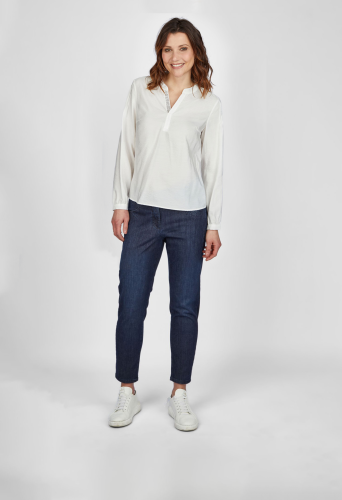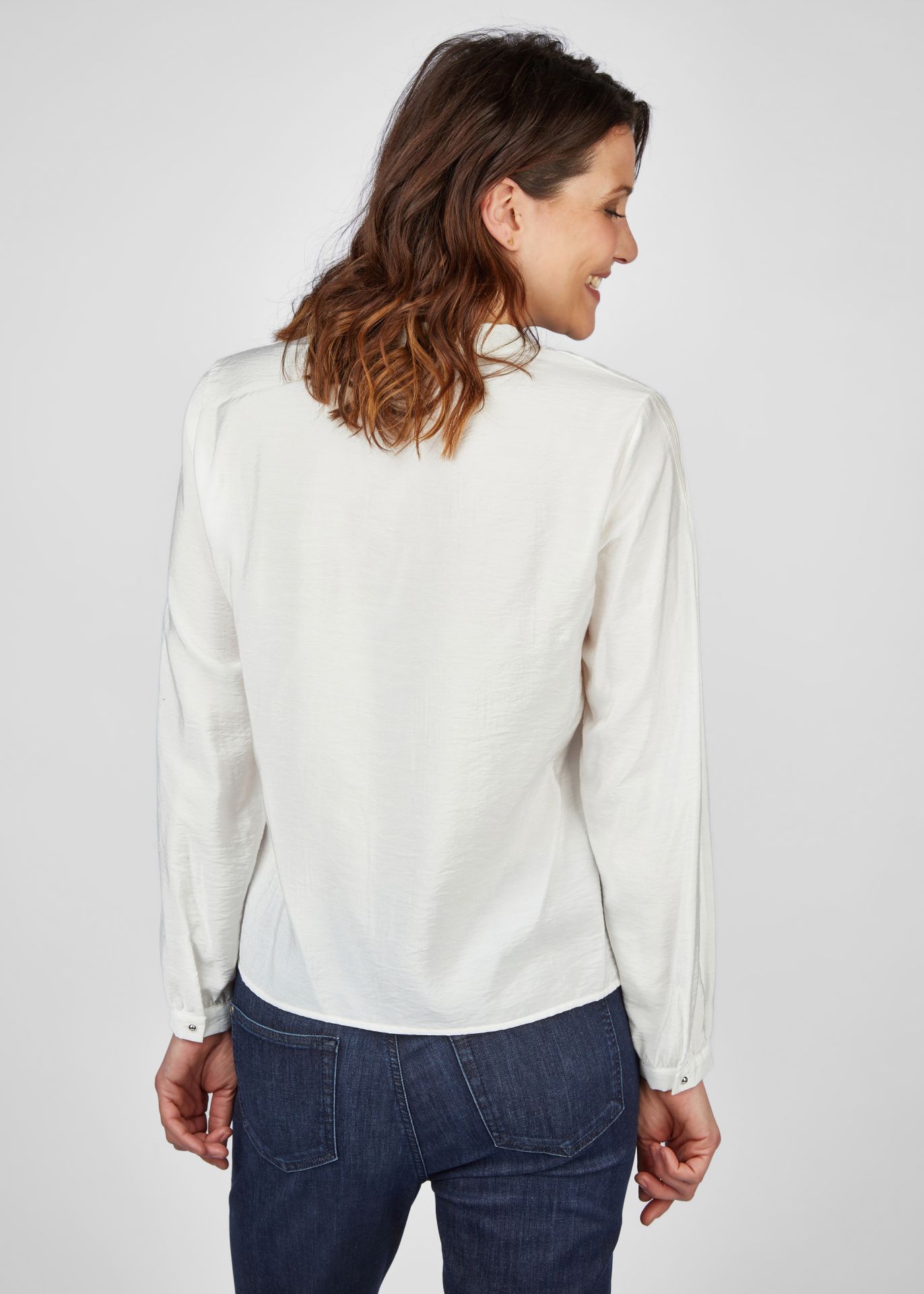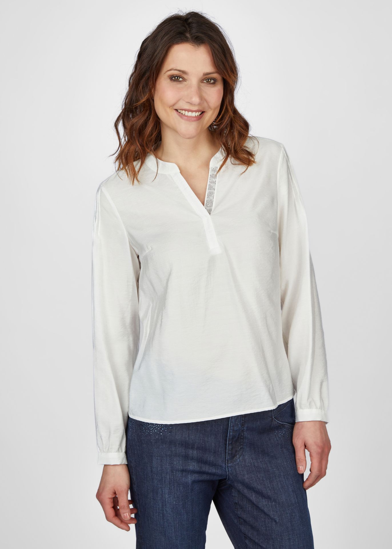 Однотонная блузка с воротником стойкой и длинными рукавами, которая создаст неподвластный времени и шикарный образ. Блузка украшена блестящей аппликацией из стразов на планке, которая придаст вашему образу особую изюминку. Рукава имеют тонкие защипы, создающие привлекательную текстуру. Эта блузка станет идеальным дополнением к любому стильному гардеробу, и ее можно комбинировать по-разному, будь то для офиса или особых случаев.