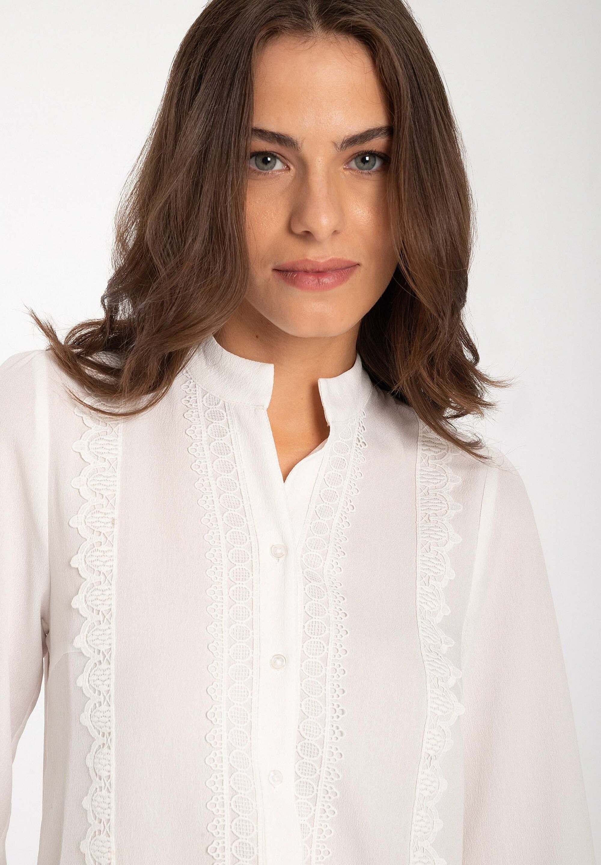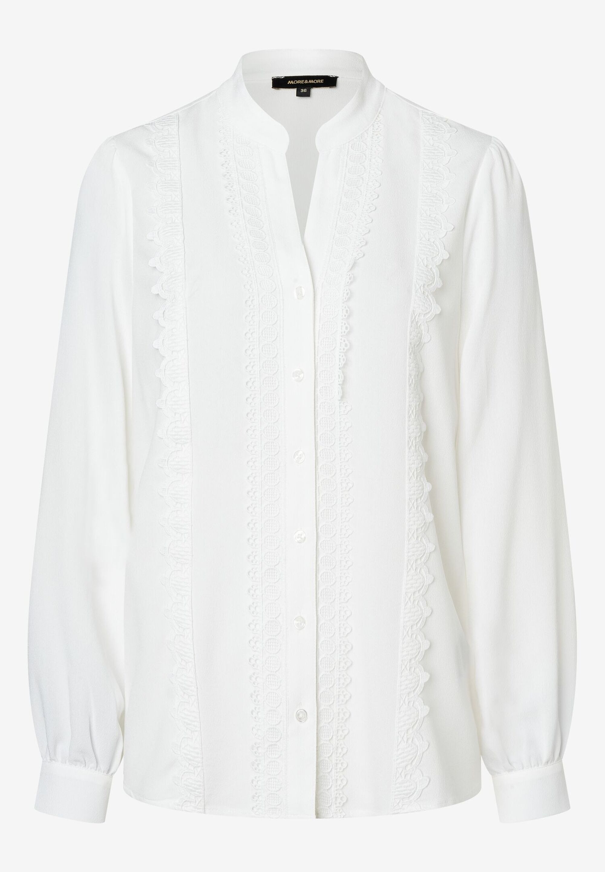 Свободная, струящаяся блузка от MORE & MORE с воротником стойкой и женственной кружевной отделкой спереди гарантирует очаровательный внешний вид. Блузку можно сочетать с классическими деловыми брюками, узкой кожаной юбкой или, в контрастном стиле, с повседневными джинсами-бойфрендами. Свободный, струящийся силуэт, сплошная планка с пуговицами, круглый вырез горловины с воротником стойкой, длинные рукава с манжетами на пуговицах и женственными рюшами. Передняя часть с декоративной кружевной каймой.