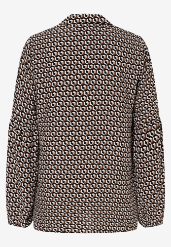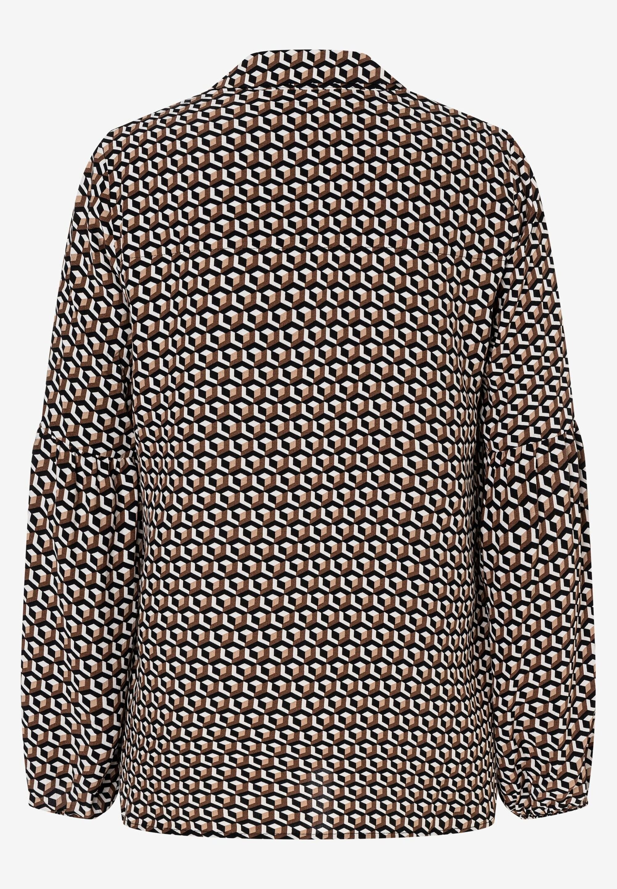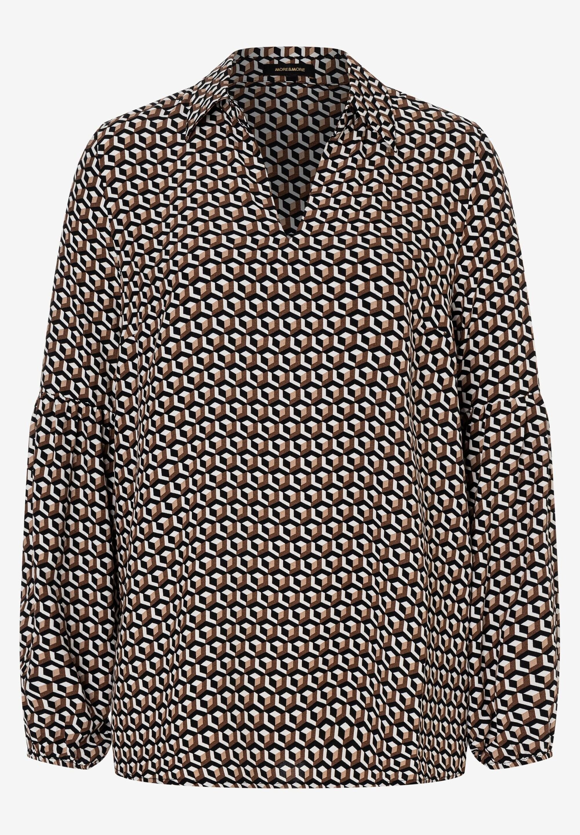 Свободная, струящаяся блузка из вискозы от MORE & MORE с графическим мини-рисунком черного/коричневого/белого цвета идеально сочетается с узкими брюками. Прямая, свободная форма, V-образный вырез с воротником рубашки, длинные рукава со сборками по швам и эластичными концами, графический мини-узор черного/коричневого/белого цвета. Длина по размеру 42 = 68см