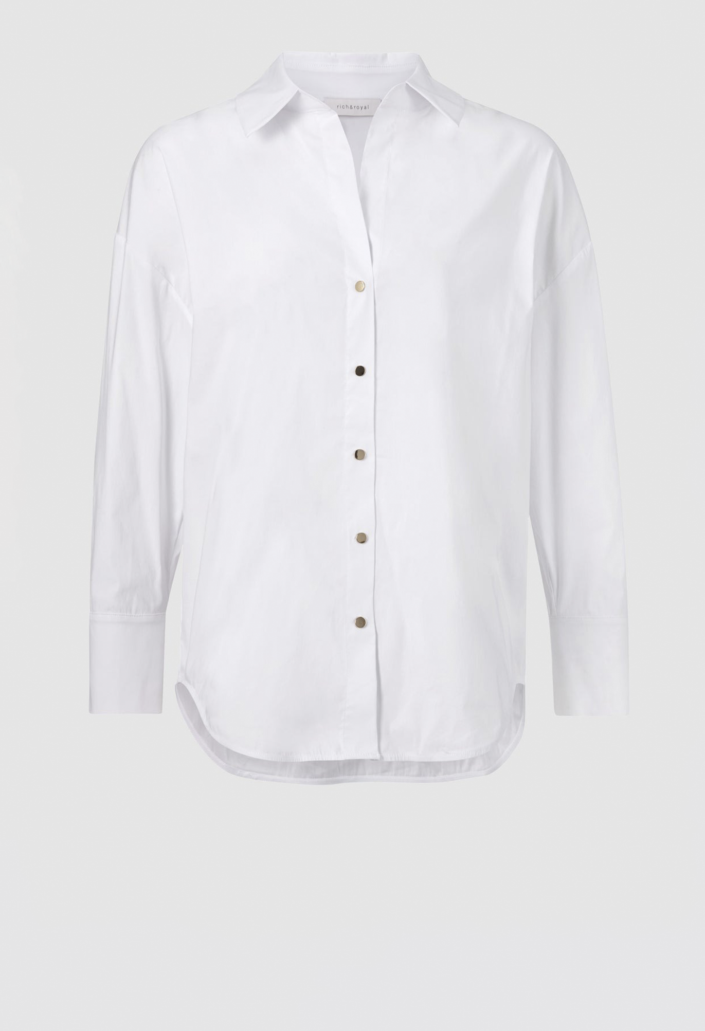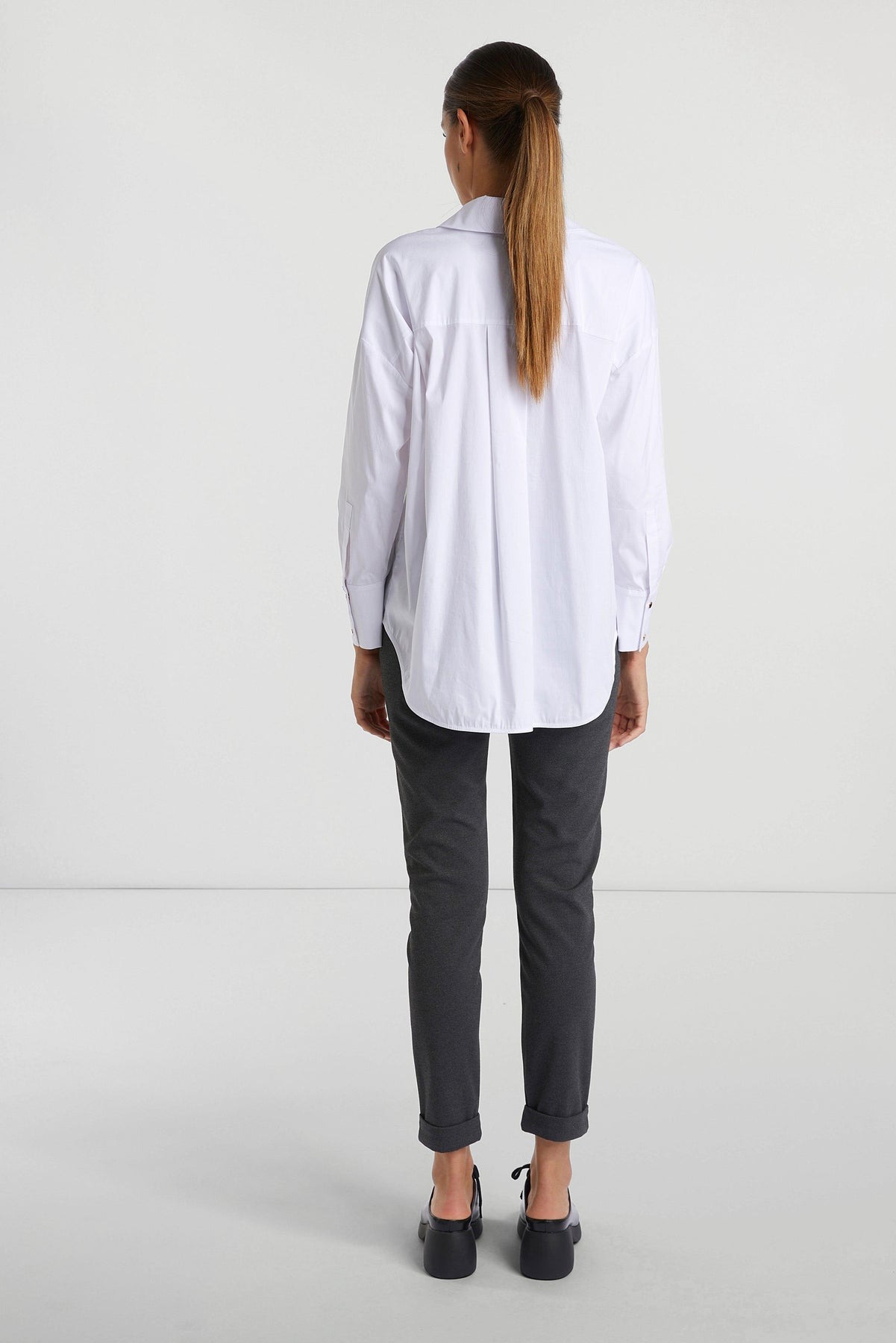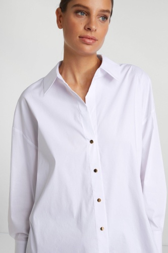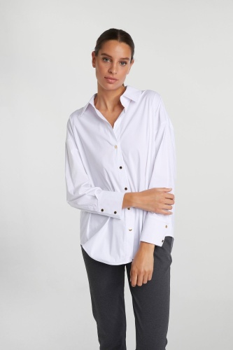 Удлиненная спина и широкий силуэт придают этой классической блузке-рубашке особую изюминку. Она также впечатляет приятным сочетанием хлопка и эластана. Застегивается на блестящие металлические кнопки