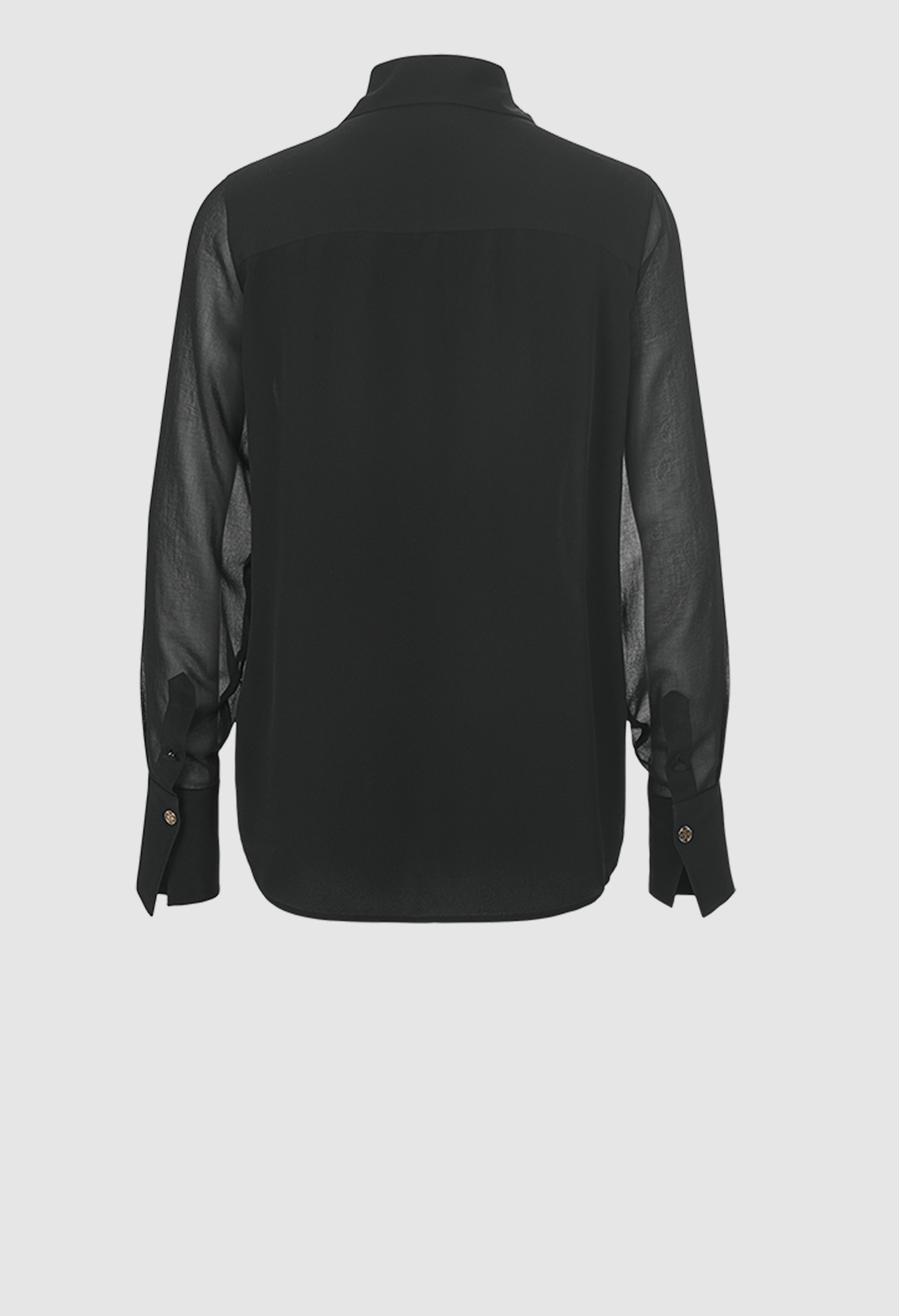 Блузка выделяется своим изящным узором из полупрозрачной и непрозрачной ткани и классическим лаконичным стилем. Эффект потрясающий и выглядит очень шикарно. В качестве материала мы выбрали легкий, не мнеющийся шелковистый креп, который идеально подходит для этого образа.