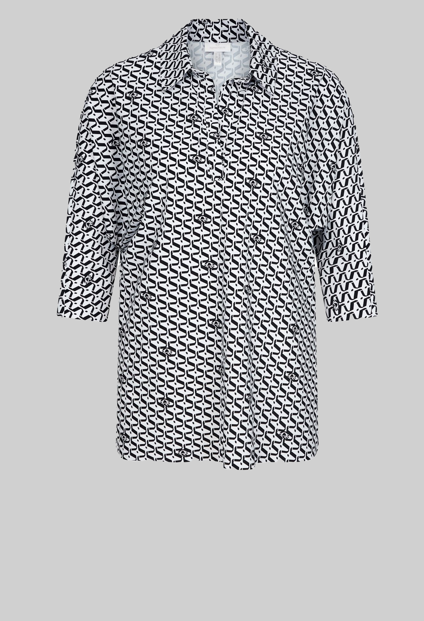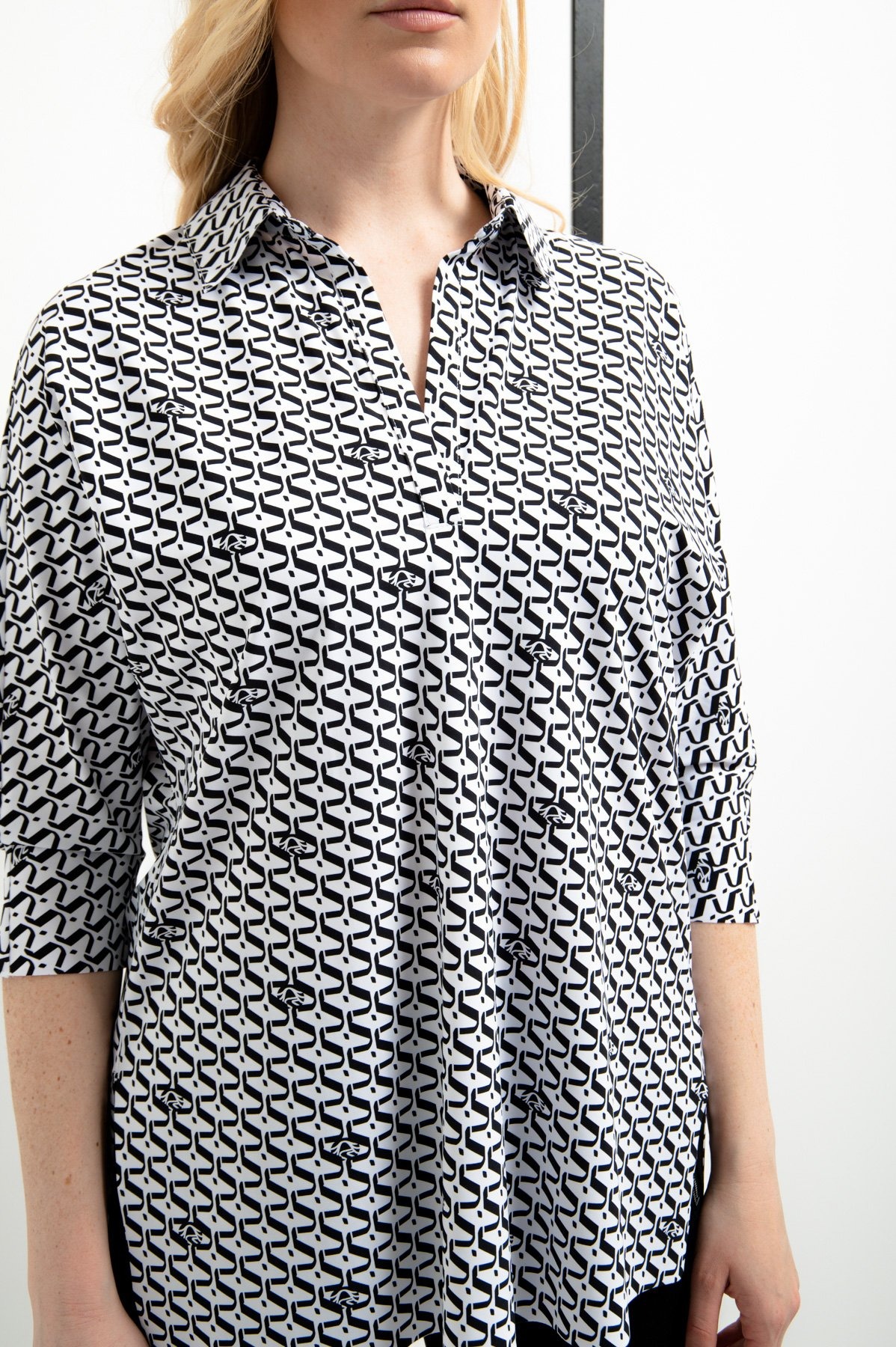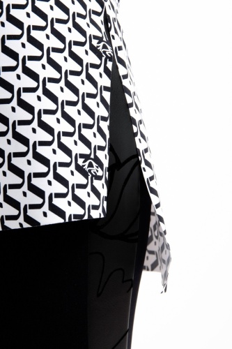 Блузка без шнуровки изготовлена из тонкого технического трикотажа с графическим принтом по всей поверхности и интегрированными логотипами Sportalm. Свободный силуэт завершают отрезные рукава 3/4. Классический воротник рубашки заканчивается небольшим разрезом посередине спереди. Края подола, края рукавов и воротника открыты, что создает эффект поношенности. В боковом шве разрезы, спинка удлинена. Длина спины размера 42 - 76,5 см.