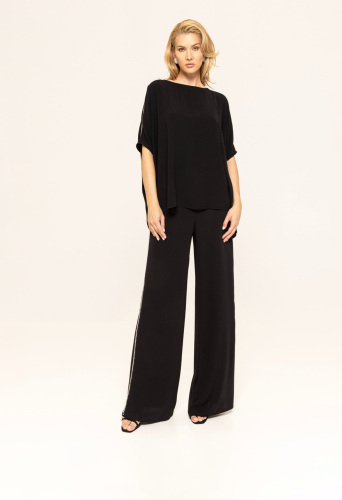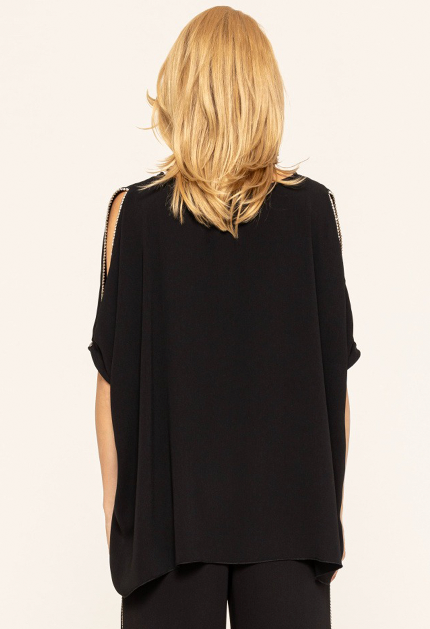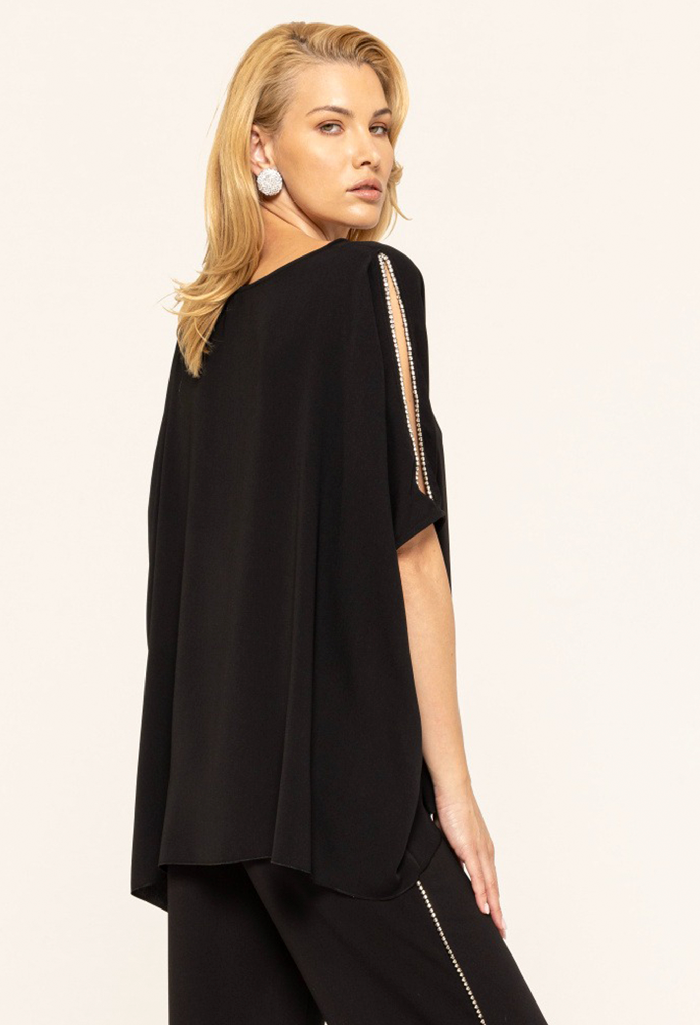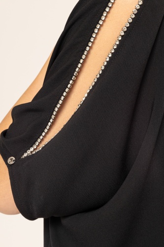 Топ с кристаллами. Легкая, удобная в носке ткань, рукав 3/4, рукава с разрезами, круглый воротник.